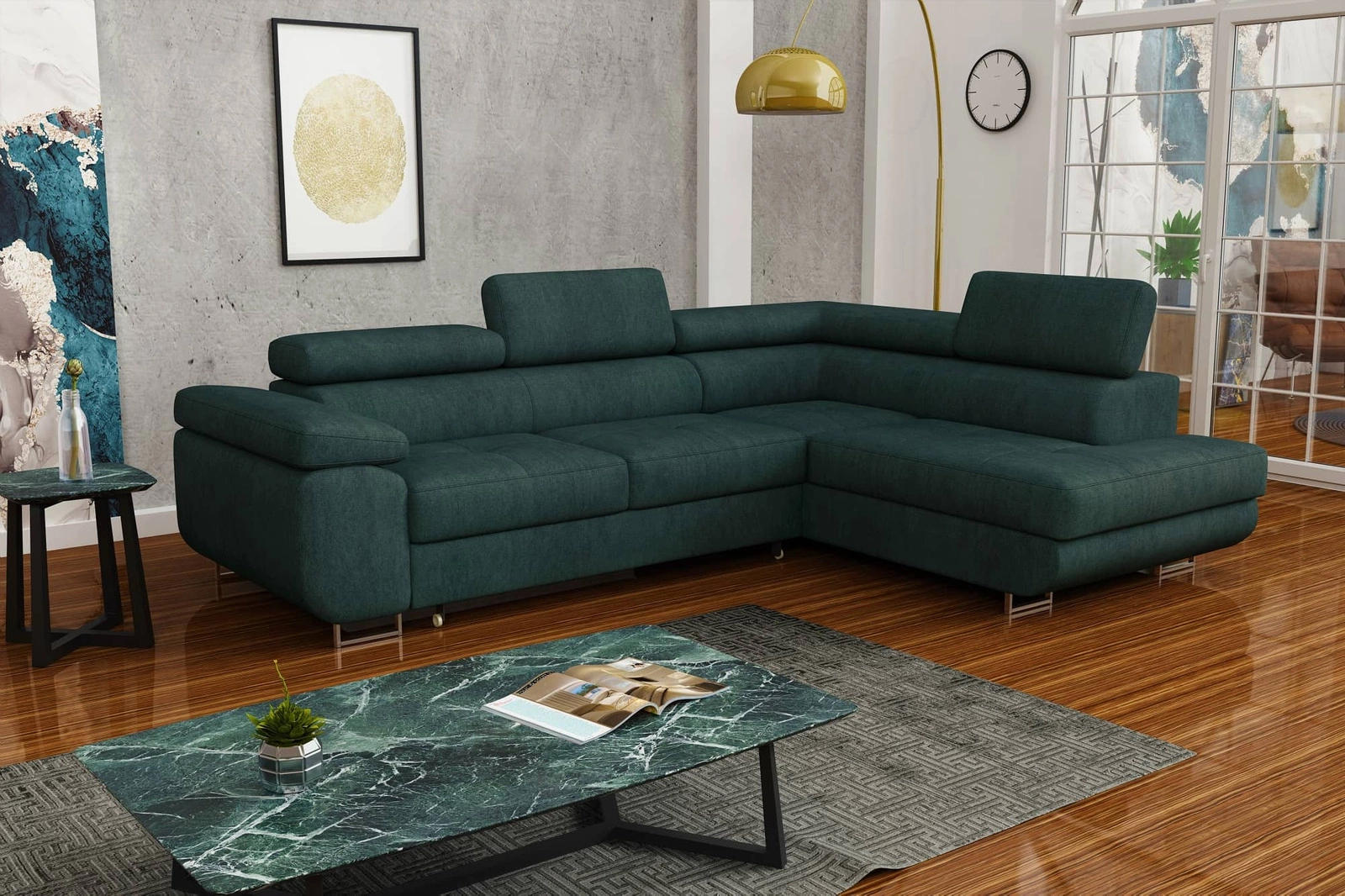 Narożnik Ganta w kolorze butelkowej zieleni z regulowanymi zagłówkami to przepis na nowoczesne wnętrze w Twoim domu!