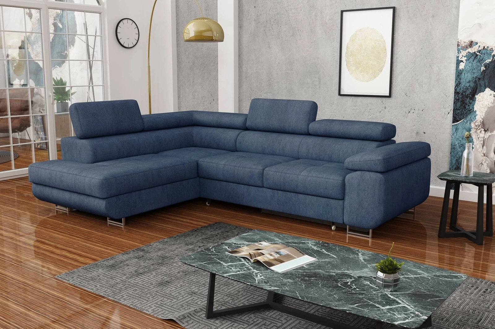 Narożnik Ganta w kolorze niebieski dżins z regulowanymi zagłówkami to przepis na nowoczesne wnętrze w Twoim domu!