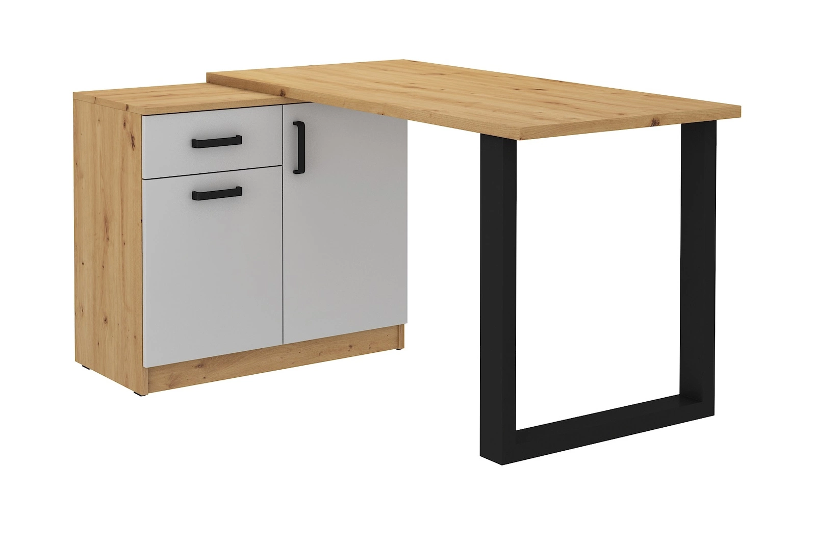 Mebel skonstruowany jest z dużego blatu oraz komody z szufladą. Biurko wykonane zostało z wysokiej jakości płyty laminowanej, która charakteryzuje się odpornością na wpływ czynników zewnętrznych takich jak obicia, uderzenia i niefortunne zadrapania. Noga wykonana została z metalowych profili 80x40x2mm pomalowanych proszkowo na kolor czarny. Blat w kolorze dąb artisan wykonany z płyty laminowanej o grubości 28mm zwiększa trwałość biurka.