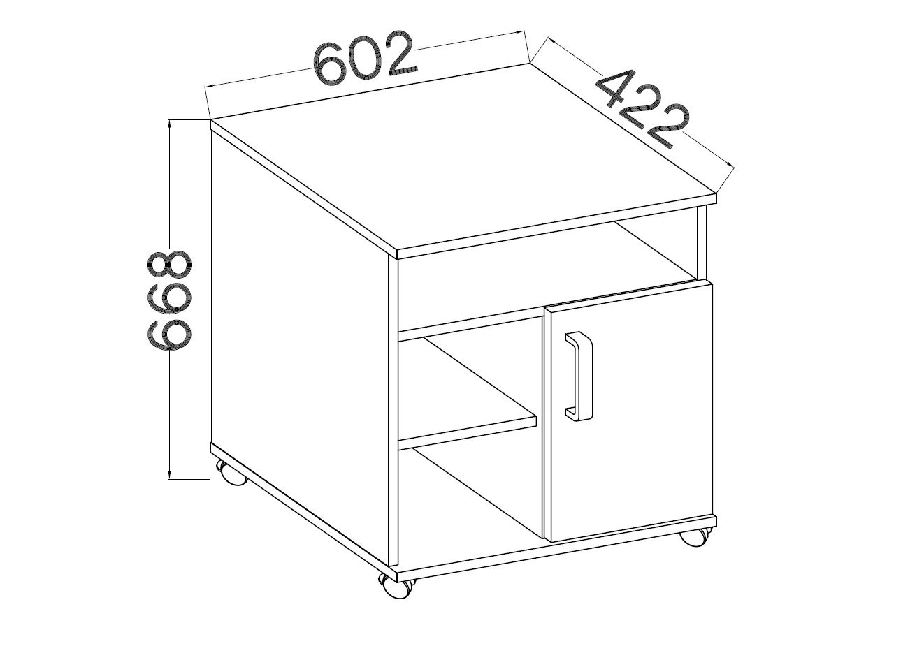 Mebel skonstruowany jest z 1 drzwi wykończonych stylowymi, metalowymi uchwytami w kolorze czarnym. Szafka wykonana została z wysokiej jakości płyty laminowanej, która charakteryzuje się odpornością na wpływ czynników zewnętrznych takich jak obicia, uderzenia i niefortunne zadrapania. Kontenerek został wyposażony w kółeczka, dzięki czemu przesuwanie mebla nie będzie uciążliwe.