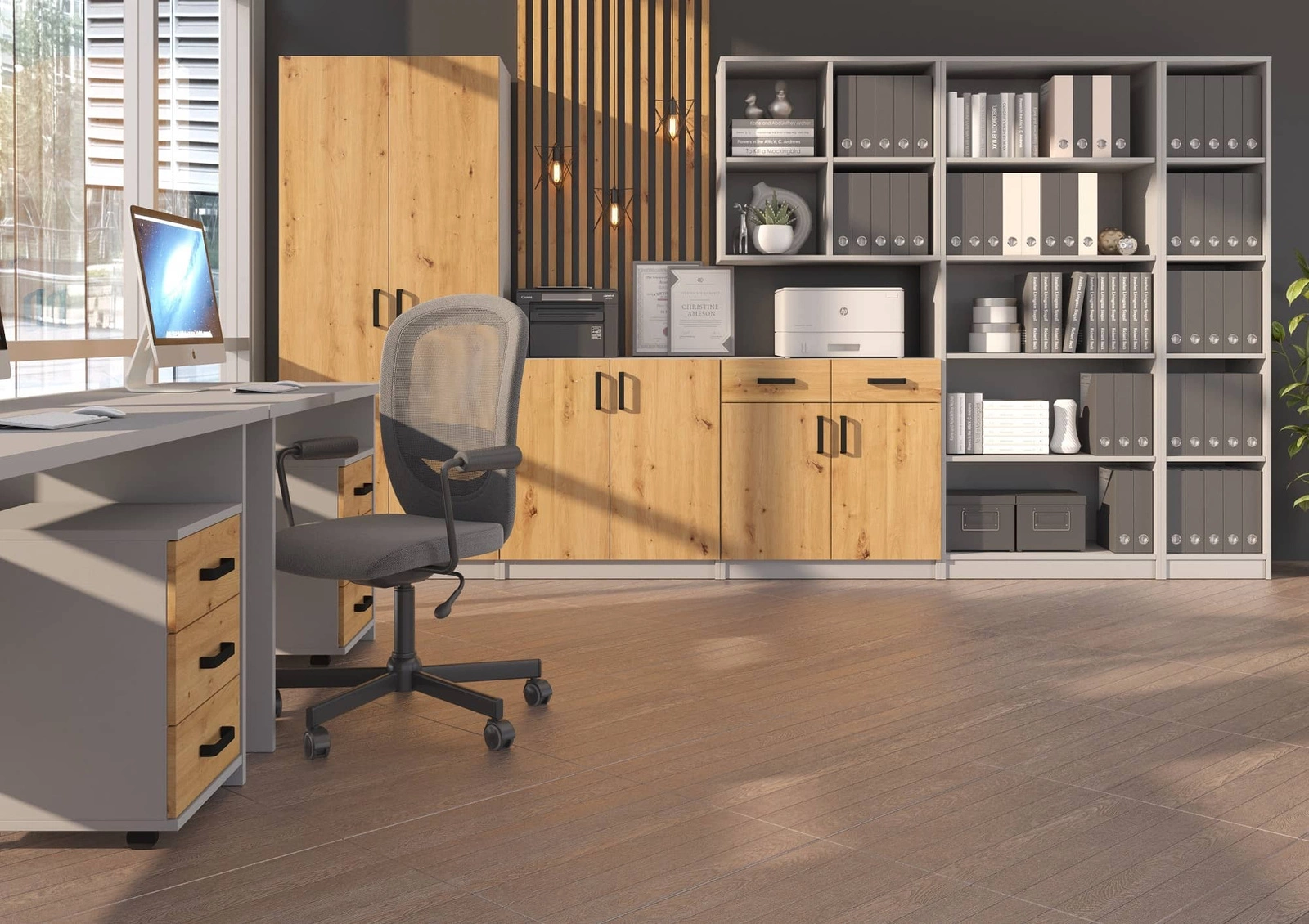Komoda Makana w kolorze jasny szary / dąb artisan jest istotnym wyposażeniem pokoju dziecka, ale również przydaje się w domowym gabinecie.