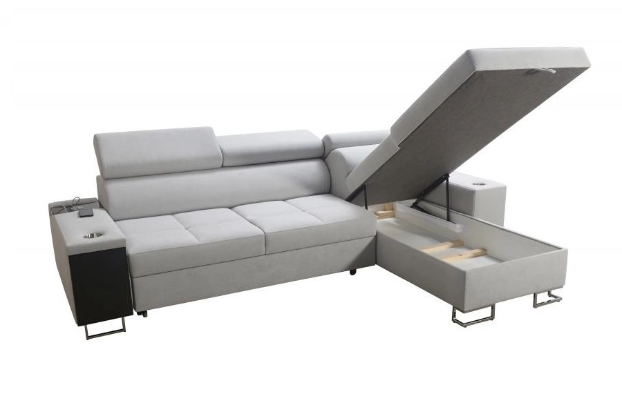 Dodatki tego mebla, które docenią wszyscy użytkownicy to pojemnik na pościel, funkcja spania, uchwyty na kubki w boczkach, gniazdo ładowania USB i gniazdo elektryczne w boczku narożnika oraz szuflada z systemem pełnego wysuwu w boczku mebla.