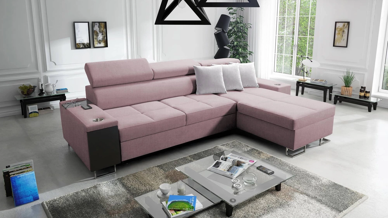 Narożnik Dafni w kolorze lawendowy róż z regulowanymi zagłówkami to przepis na nowoczesne wnętrze w Twoim domu!