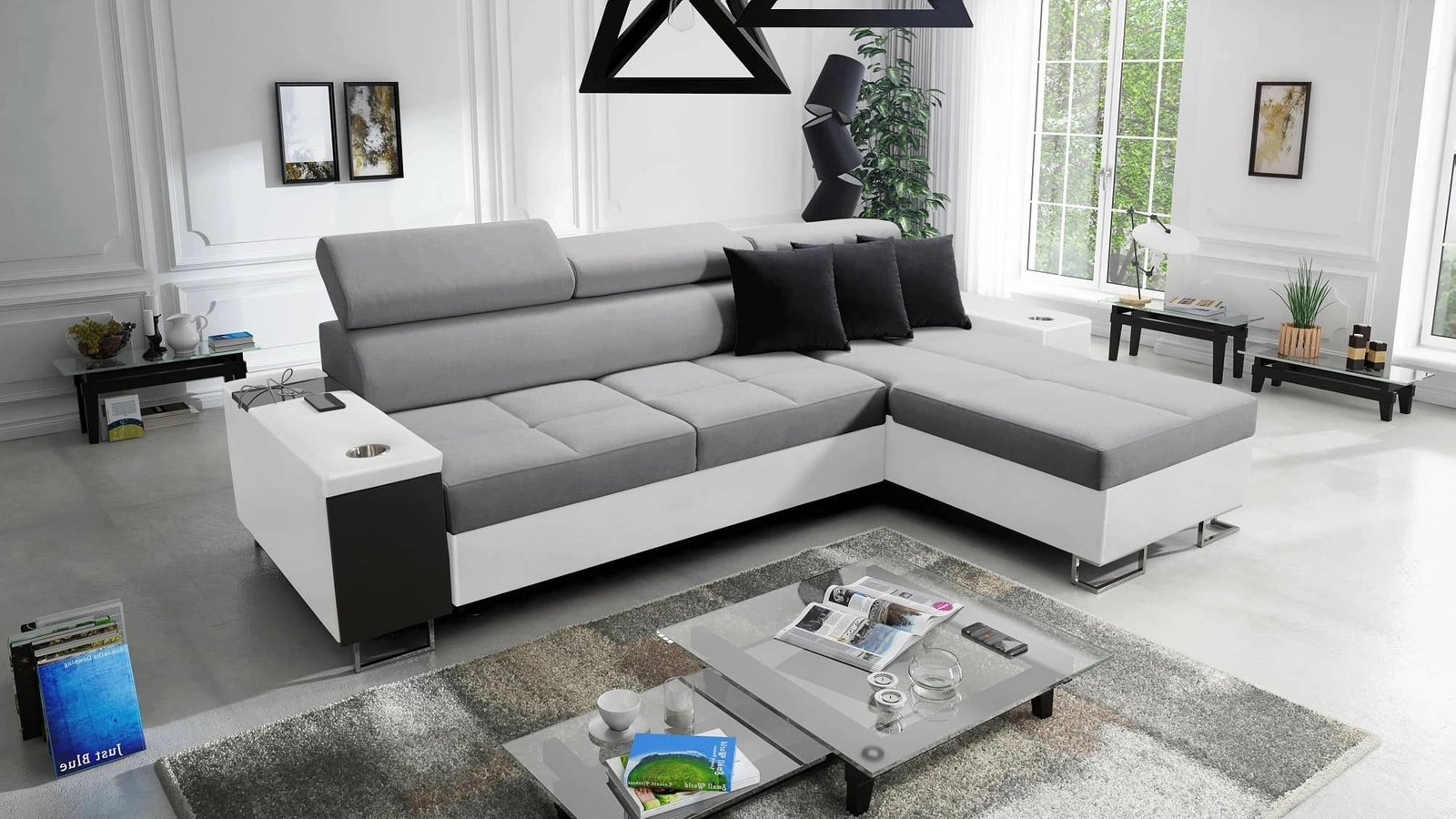 Dodatki tego mebla, które docenią wszyscy użytkownicy to pojemnik na pościel, funkcja spania, uchwyty na kubki w boczkach, gniazdo ładowania USB i gniazdo elektryczne w boczku narożnika oraz szuflada z systemem pełnego wysuwu w boczku mebla.