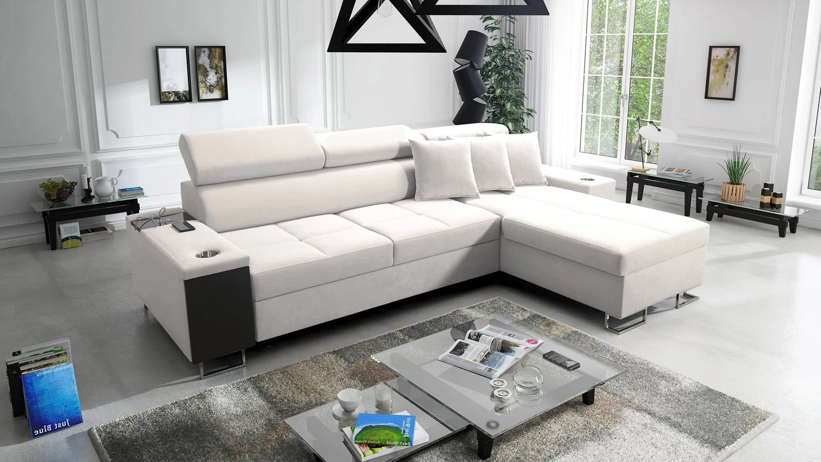 Dodatki tego mebla, które docenią wszyscy użytkownicy to pojemnik na pościel, funkcja spania, uchwyty na kubki w boczkach, gniazdo ładowania USB i gniazdo elektryczne w boczku narożnika oraz szuflada z systemem pełnego wysuwu w boczku mebla.