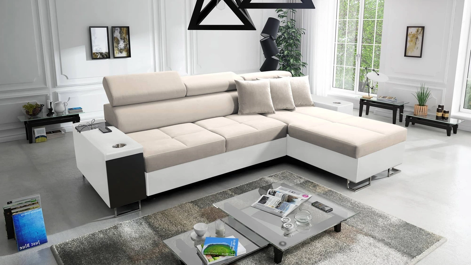 Dodatki tego mebla, które docenią wszyscy użytkownicy to pojemnik na pościel, funkcja spania, uchwyty na kubki w boczkach, gniazdo ładowania USB i gniazdo elektryczne w boczku narożnika oraz szuflada z systemem pełnego wysuwu w boczku mebla.