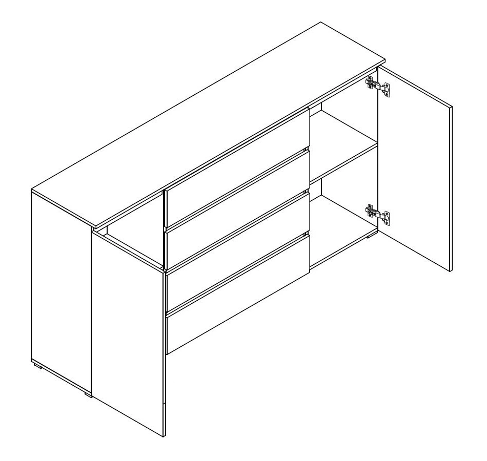 Mebel skonstruowany jest z 2 drzwi oraz 4 szuflad wysuwanych na prowadnicach rolkowych. Komoda została wykonana z wysokiej jakości płyty laminowanej, która charakteryzuje się odpornością na wpływ czynników zewnętrznych takich jak obicia, uderzenia i niefortunne zadrapania.