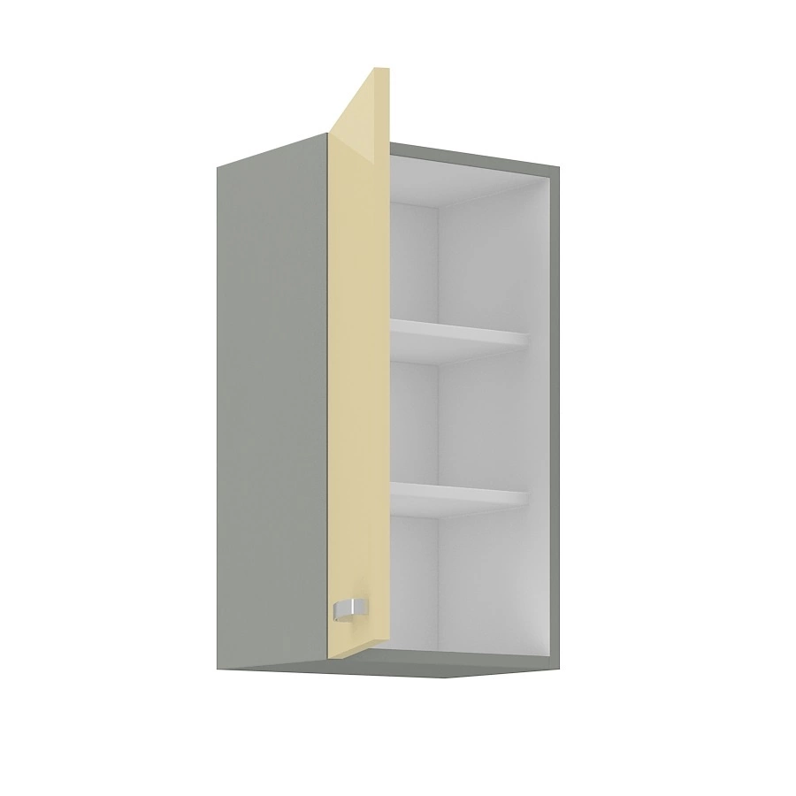 Szafka kuchenna została podzielona na trzy części. Półki można wyciągnąć i uzyskać miejsce na wysokie przedmioty. Drzwi są uniwersalne i można je zamontować po prawej lub po lewej stronie. Standardowym wyposażeniem szafki są zawiasy z systemem cichego domykania, który zwiększa komfort i bezpieczeństwo użytkowania mebli.