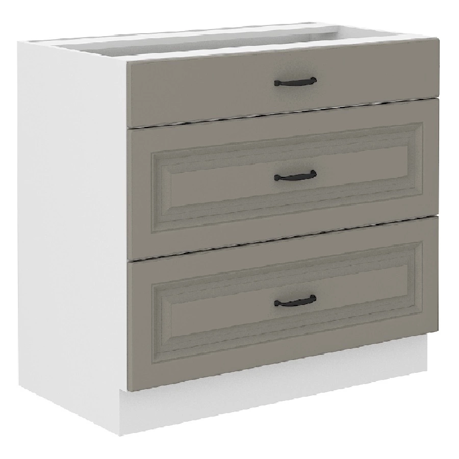 Szafka kuchenna stojąca Kastos 80 D 3S BB to połączenie klasycznego designu z nowoczesną funkcjonalnością, które idealnie odnajdzie się w każdej kuchni. Przemyślana konstrukcja z trzema pojemnymi szufladami zapewnia wygodne przechowywanie akcesoriów kuchennych, sztućców czy naczyń, pomagając utrzymać porządek w przestrzeni. Kolorystyka mebla, łącząca stonowane odcienie frontów z kontrastującym białym korpusem, pozwala na łatwe dopasowanie do różnorodnych aranżacji. Subtelne czarne uchwyty nadają elegancji, a trwałe materiały gwarantują długowieczność i odporność na codzienne użytkowanie.