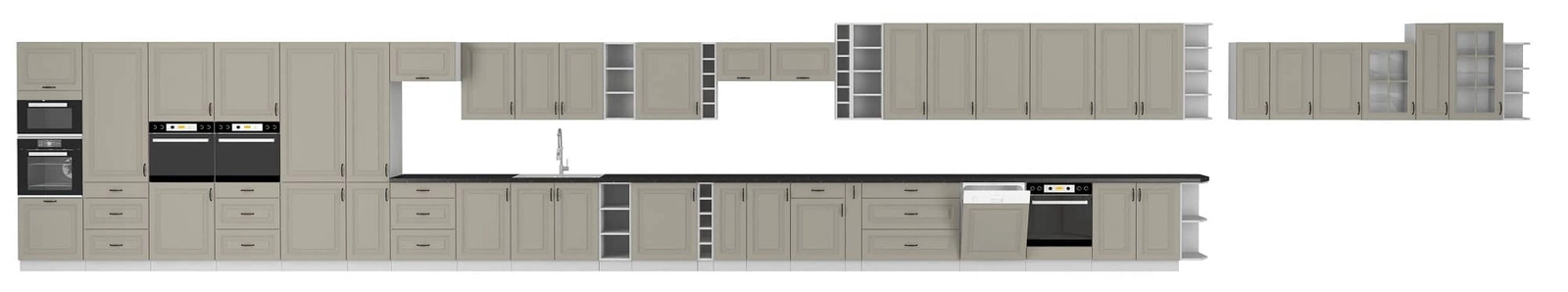 Front szafki kuchennej pod zlewozmywak w kolorze szary beż został wykonany z płyty MDF oraz wykończony stylowym frezem. Obrzeża frontu szafki kuchennej zabezpiecza okleina ABS, która spełnia dwie funkcje. Jest zabezpieczeniem przeciw wilgoci oraz chroni przed przypadkowym uszkodzeniem.