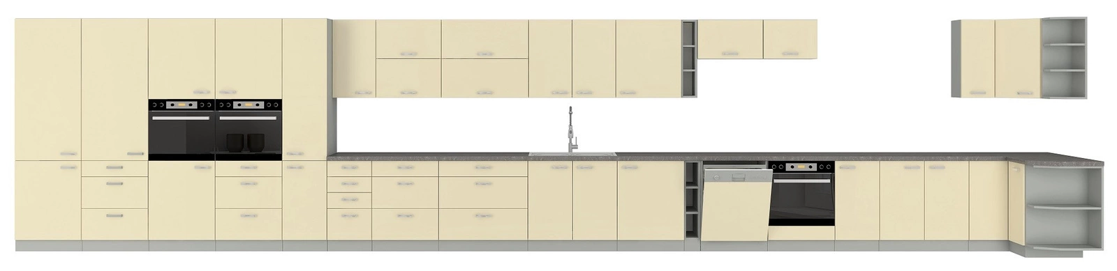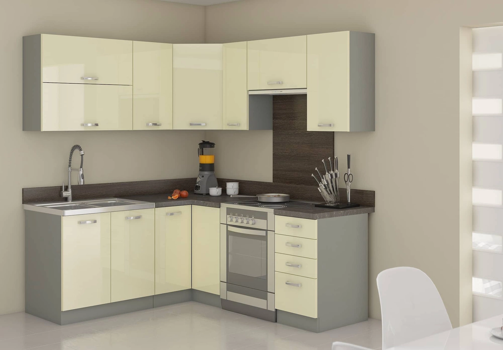 Fronty w kolorze kremowym zostały wykonane z płyty MDF oraz oklejone folią w połysku. Obrzeża frontów zabezpiecza okleina PVC, która spełnia dwie funkcje. Jest zabezpieczeniem przeciw wilgoci oraz chroni przed przypadkowym uszkodzeniem.