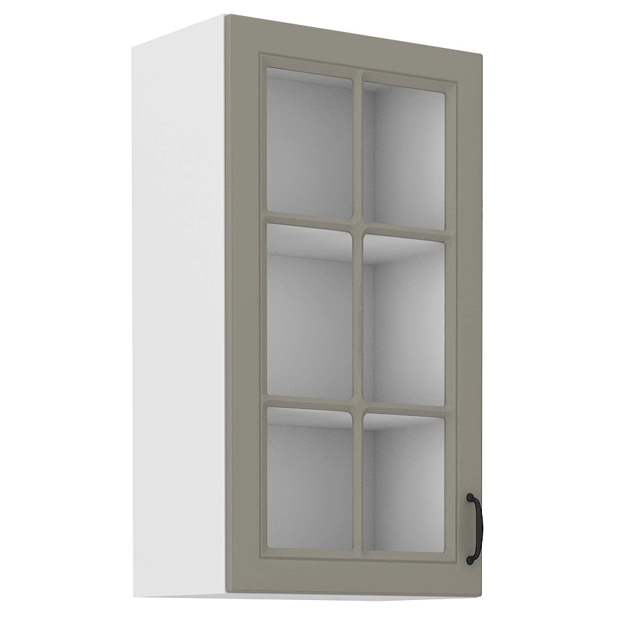 Front szafki kuchennej wiszącej w kolorze szary beż został wykonany z płyty MDF oraz wykończony stylowym frezem i szklaną witryną. Obrzeża frontu szafki kuchennej zabezpiecza okleina ABS, która spełnia dwie funkcje. Jest zabezpieczeniem przeciw wilgoci oraz chroni przed przypadkowym uszkodzeniem.