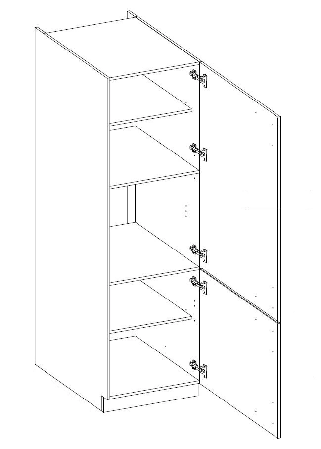 Półki słupka kuchennego posiadają trzystopniową regulacje wysokości, dzięki czemu można uzyskać miejsce na wysokie przedmioty. Drzwi są uniwersalne i można je zamontować po prawej lub po lewej stronie. Standardowym wyposażeniem szafki kuchennej są zawiasy z systemem cichego domykania. Spowalniacze zwiększają komfort i bezpieczeństwo użytkowania mebli.