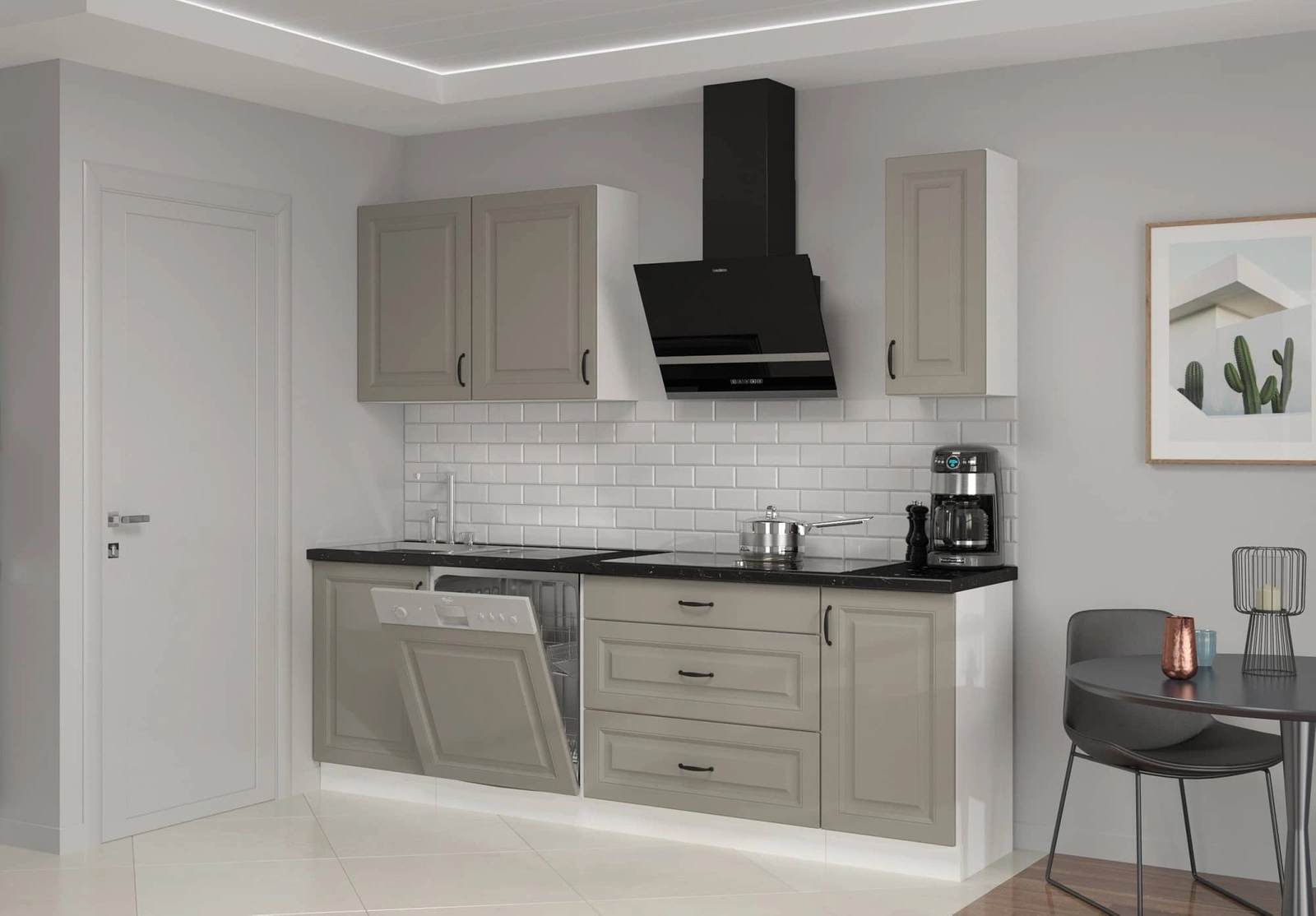 Dzięki uniwersalnemu ustawieniu, meble kuchenne dopasują się do wnętrza każdej kuchni. Fronty w kolorze szary beż oraz białe korpusy, nadają meblom kuchennym szczególnego charakteru. Czarne, metalowe uchwyty podkreślają elegancję szafek kuchennych.