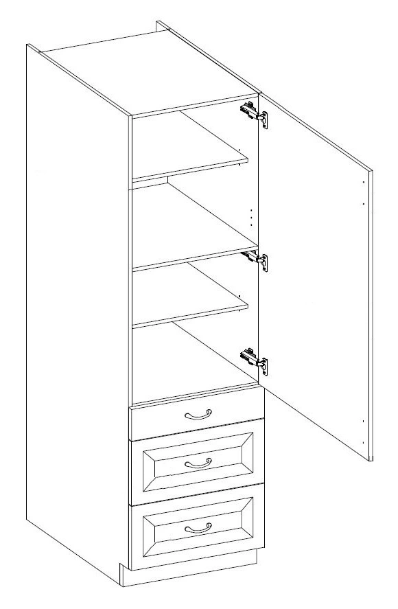 Część słupka kuchennego z półkami, które posiadają trzystopniową regulację wysokości, dzięki czemu można uzyskać miejsce na wysokie przedmioty. Część z 3 szufladami wykonanymi w technologii Premium Box. Szuflady słupka kuchennego Premium Box charakteryzują się zwiększoną wytrzymałością, dzięki czemu szafkę kuchenną można wypełnić po brzegi przyborami i akcesoriami kuchennymi. Drzwi szafki kuchennej są uniwersalne i można je zamontować po prawej lub po lewej stronie. Standardowym wyposażeniem szafki kuchennej są szuflady oraz zawiasy z systemem cichego domykania. Spowalniacze zwiększają komfort i bezpieczeństwo użytkowania mebli.