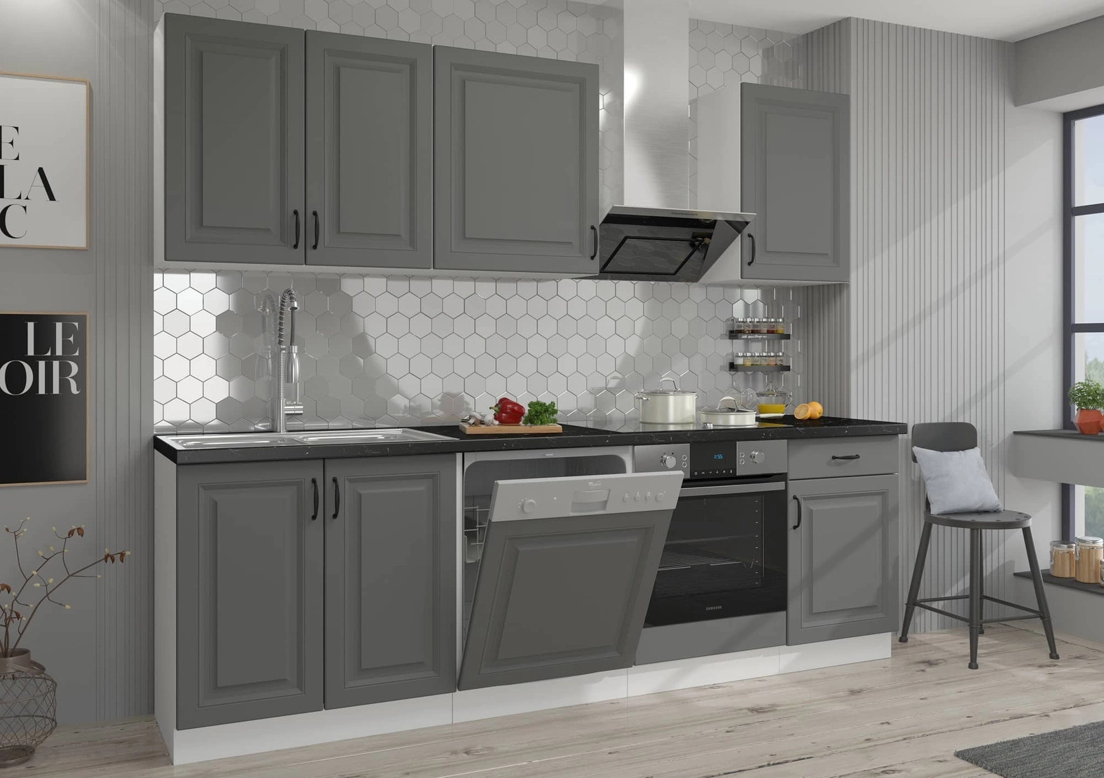 Zestaw mebli kuchennych Tilos w kolorze szary popiel/ biały to propozycja gotowego zestawu mebli do kuchni, który doskonale prezentuje się we wnętrzach skandynawskich, klasycznych oraz nowoczesnych.