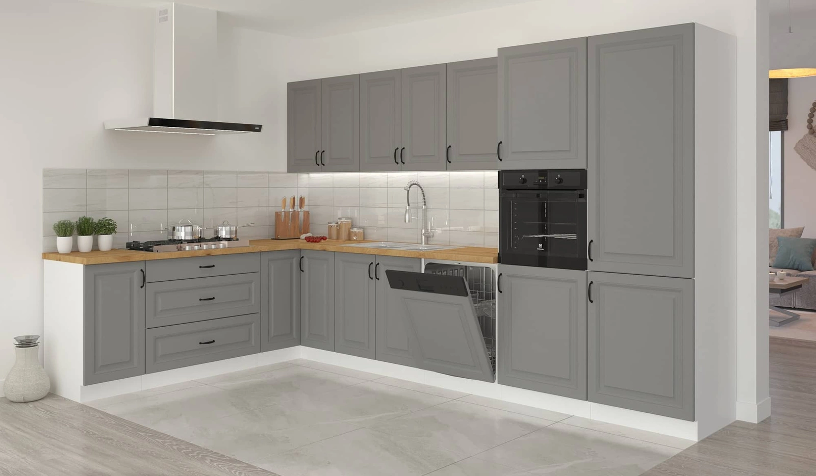 Zestaw mebli kuchennych Tilos w kolorze szary popiel / biały to propozycja gotowego zestawu mebli do kuchni, który doskonale prezentuje się we wnętrzach skandynawskich, klasycznych oraz nowoczesnych.