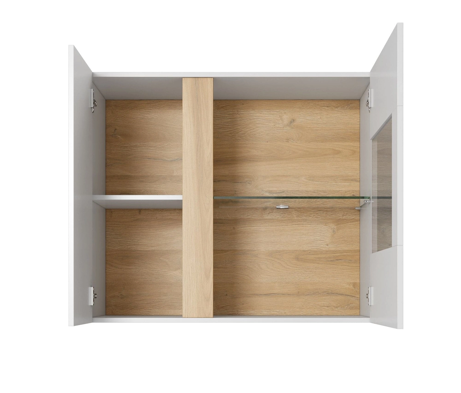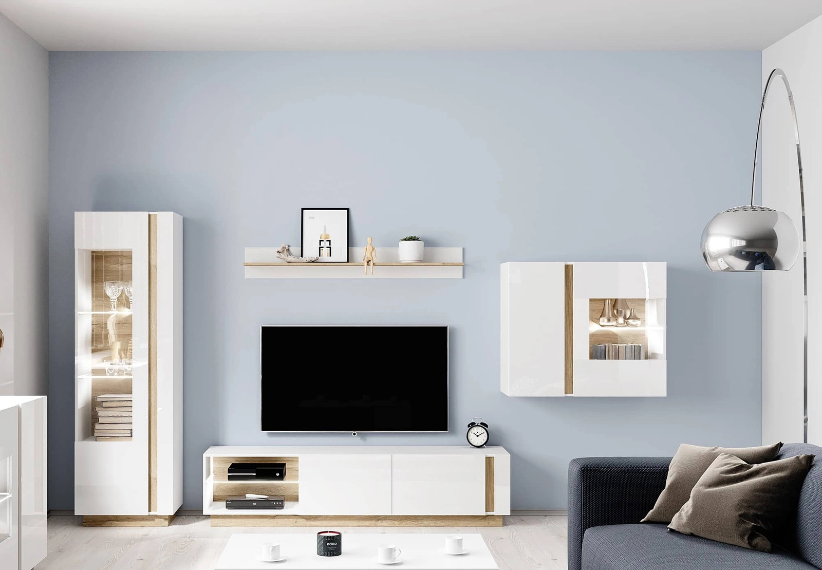 Meblościanka Adria jest idealnym wyborem dla miłośników nowoczesnych aranżacji o eleganckim charakterze, dla których ważna jest również szeroka funkcjonalność mebla. Białe fronty wykończone na wysoki połysk zostały przełamane wstawkami w kolorze dąb grandson. Meblościanka wykonana została z wysokiej jakości płyty laminowanej, która charakteryzuje się odpornością na wpływ czynników zewnętrznych takich jak obicia, uderzenia i niefortunne zadrapania. Fronty wykonane z płyty MDF wykończono folią w połysku. Witryny oraz szafkę RTV meblościanki wyposażono w szklane półki które można podświetlić oprawami LED.