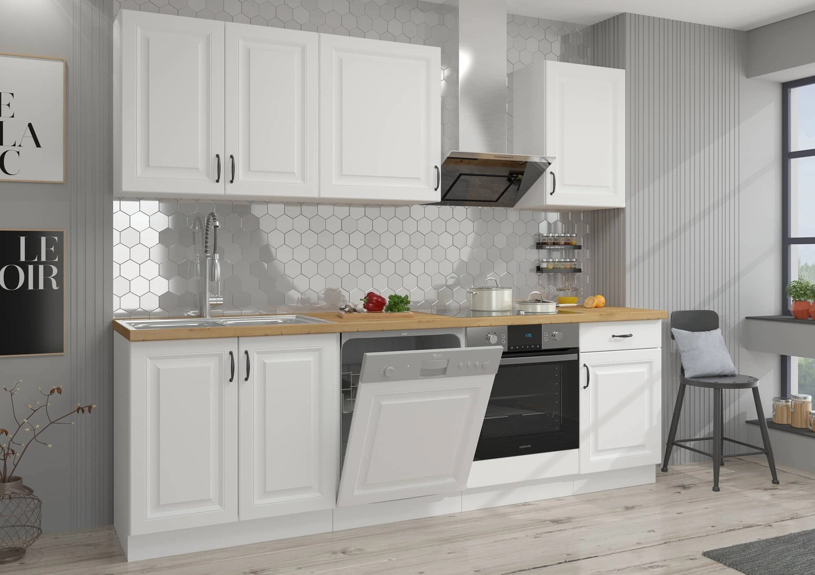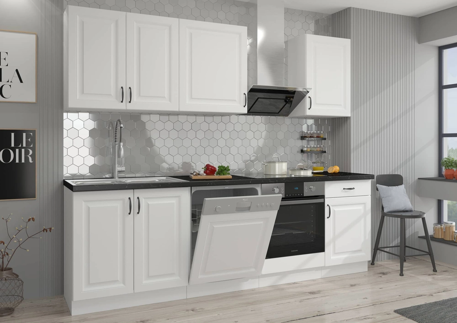 Zestaw mebli kuchennych Snow 250 cm szafki doskonale prezentują się we wnętrzach skandynawskich klasycznych oraz nowoczesnych
