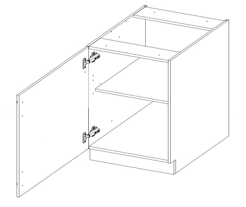 Półka nie jest przykręcona do korpusu szafki, dzięki czemu można ją wyciągnąć i uzyskać miejsce na wysokie przedmioty. Drzwi są uniwersalne i można je zamontować po prawej lub po lewej stronie. Standardowym wyposażeniem szafki kuchennej są zawiasy z systemem cichego domykania. Spowalniacze zwiększają komfort i bezpieczeństwo użytkowania mebli.