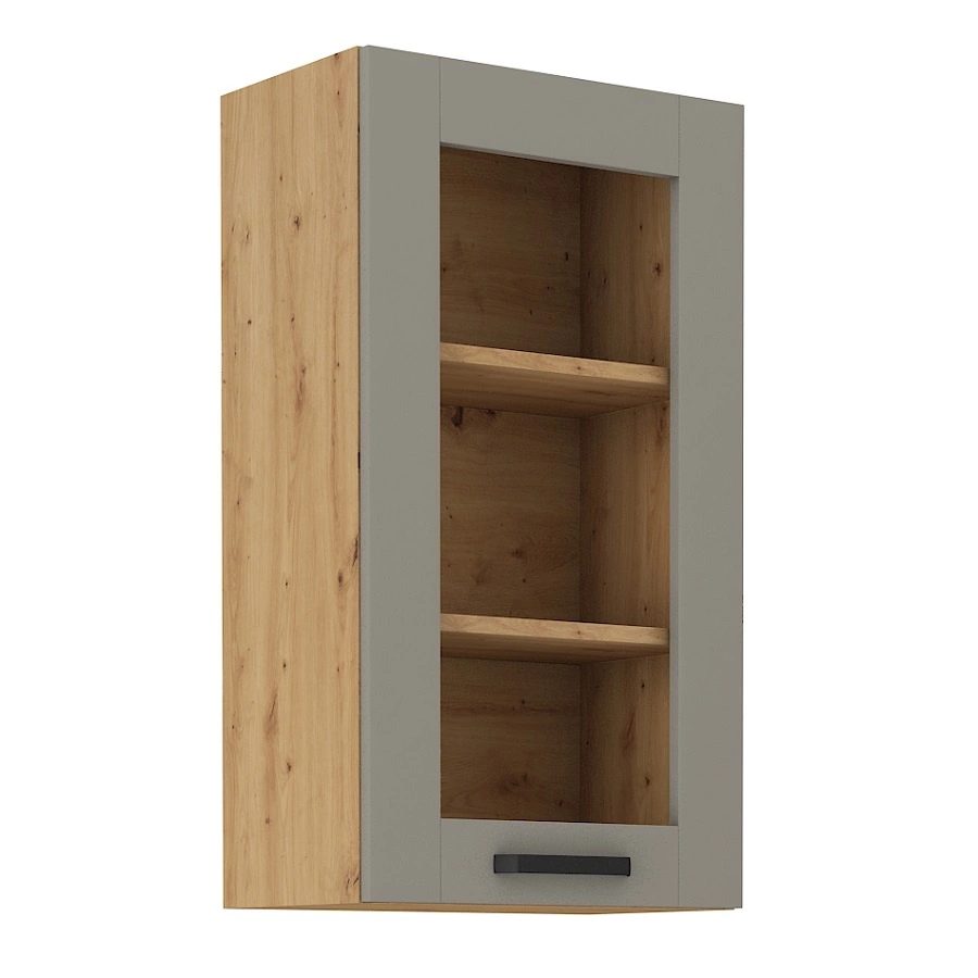 Szafka kuchenna wisząca z witryną Linosa w kolorze szary beż / dąb artisan należy do kategorii mebli kuchennych modułowych, z których można utworzyć dowolne zestawy.