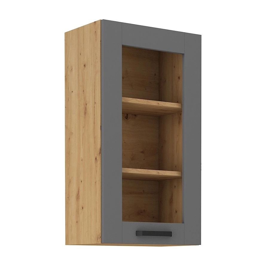 Szafka kuchenna wisząca z witryną Asti w kolorze szary popiel / dąb artisan należy do kategorii mebli kuchennych modułowych, z których można utworzyć dowolne zestawy.