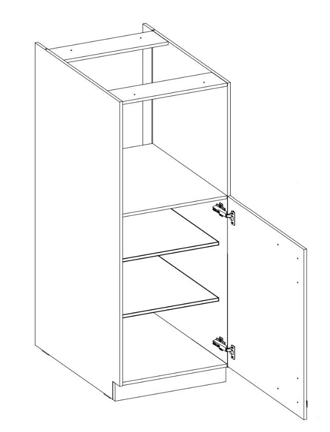 Półki słupka kuchennego posiada regulacje wysokości, dzięki czemu można uzyskać miejsce na wysokie przedmioty. Drzwi są uniwersalne i można je zamontować po prawej lub po lewej stronie. Standardowym wyposażeniem szafki kuchennej są zawiasy z systemem cichego domykania, który zwiększa komfort i bezpieczeństwo użytkowania mebli.