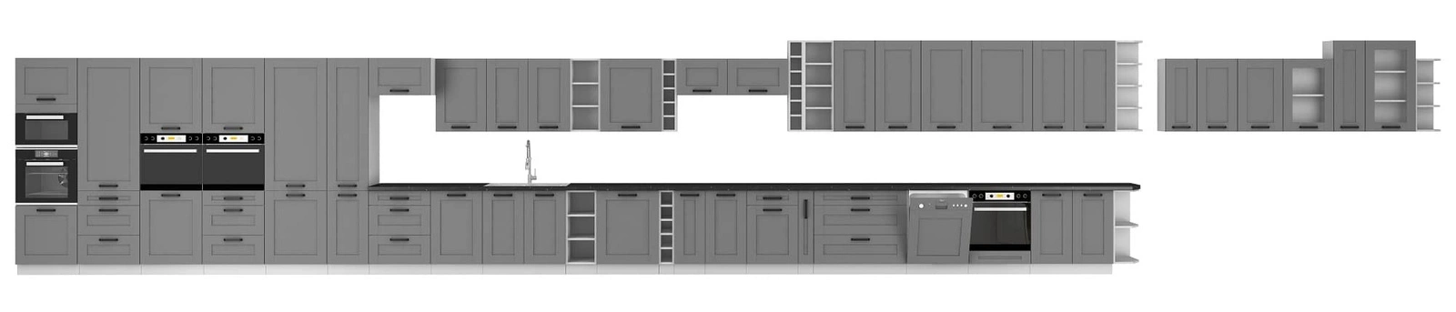 Fronty słupka kuchennego w kolorze szary popiel zostały wykonane z płyty MDF oraz wykończone stylową ramką. Obrzeża frontu szafki kuchennej zabezpiecza okleina, która spełnia dwie funkcje. Jest zabezpieczeniem przeciw wilgoci oraz chroni przed przypadkowym uszkodzeniem.