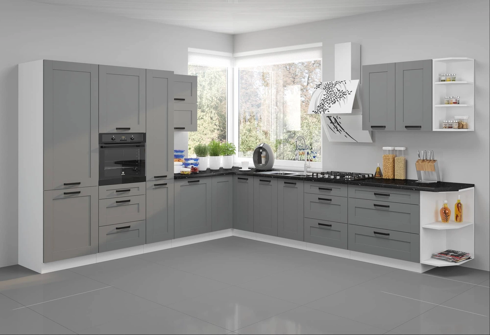 Dzięki uniwersalnemu ustawieniu, meble kuchenne dopasują się do wnętrza każdej kuchni. Fronty w kolorze szary popiel oraz białe korpusy, nadają meblom kuchennym szczególnego charakteru. Czarne, metalowe uchwyty podkreślają elegancję szafek kuchennych.