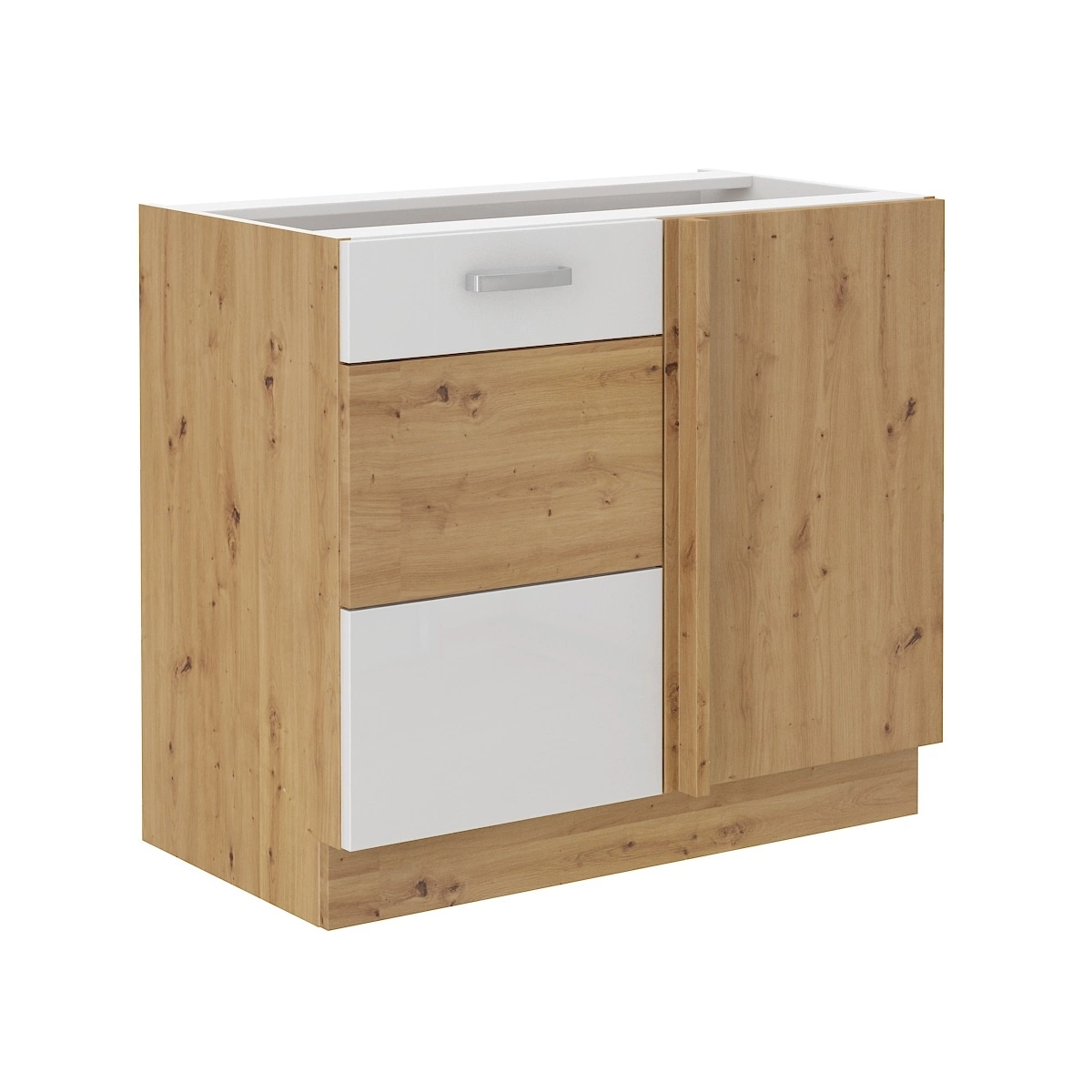 Szafka kuchenna narożna stojąca Alpine w kolorze biały / dąb artisan należy do kategorii mebli kuchennych modułowych, z których można utworzyć dowolne zestawy.