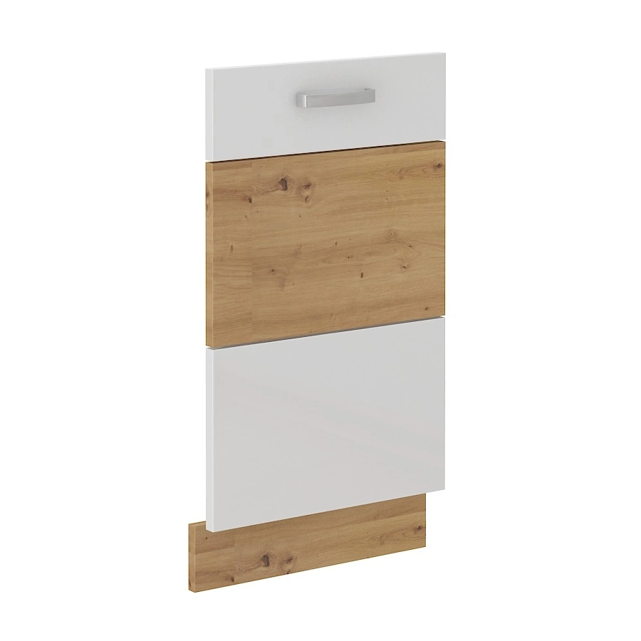 Front do zmywarki 45 cm Alpine w kolorze białym wykonany z płyty MDF został przełamany wstawką w kolorze dąb artisan.
