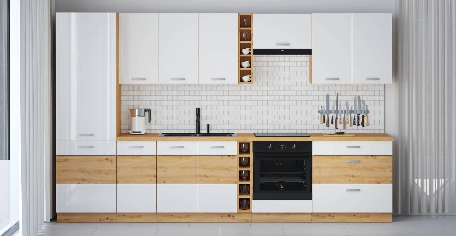 Dzięki uniwersalnemu ustawieniu, meble kuchenne dopasują się do wnętrza każdej kuchni. Białe fronty oraz korpusy wykończone w dębowym dekorze, nadają meblom kuchennym szczególnego charakteru. Chromowane, metalowe uchwyty podkreślają elegancję szafek kuchennych.