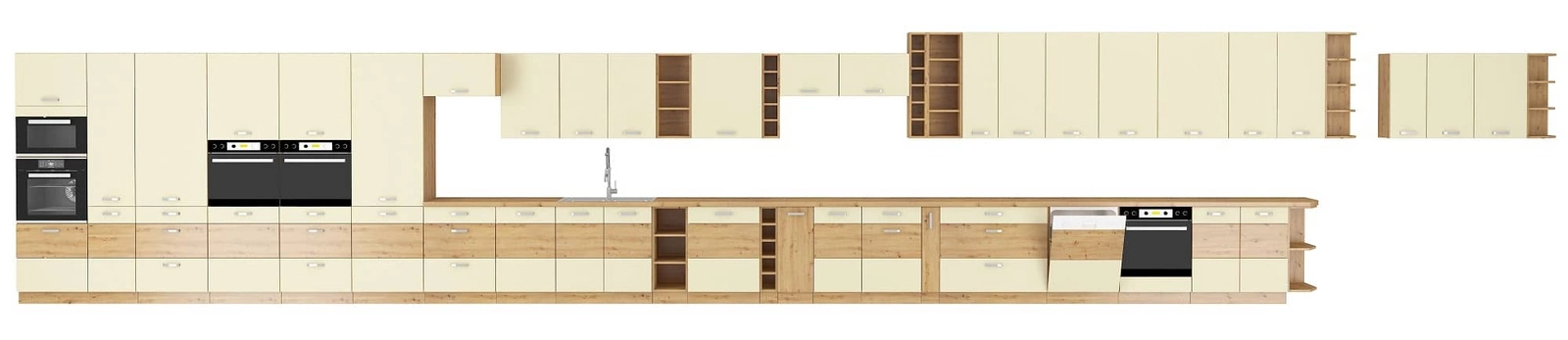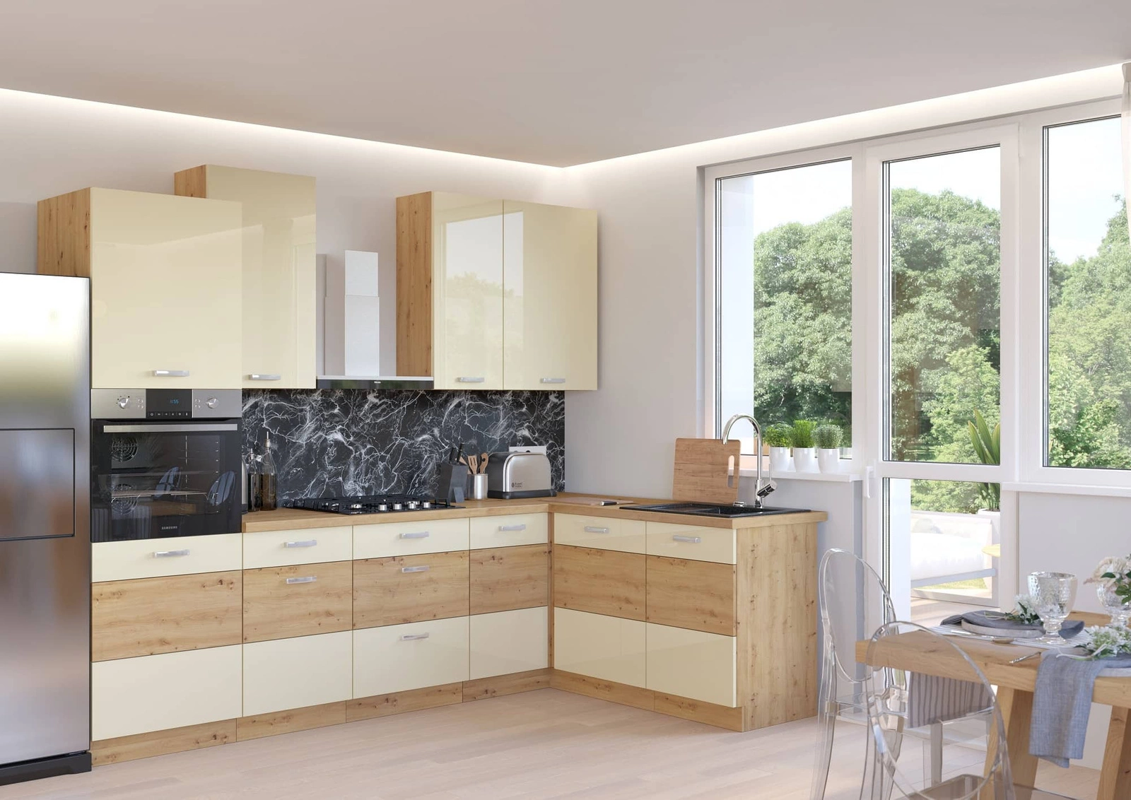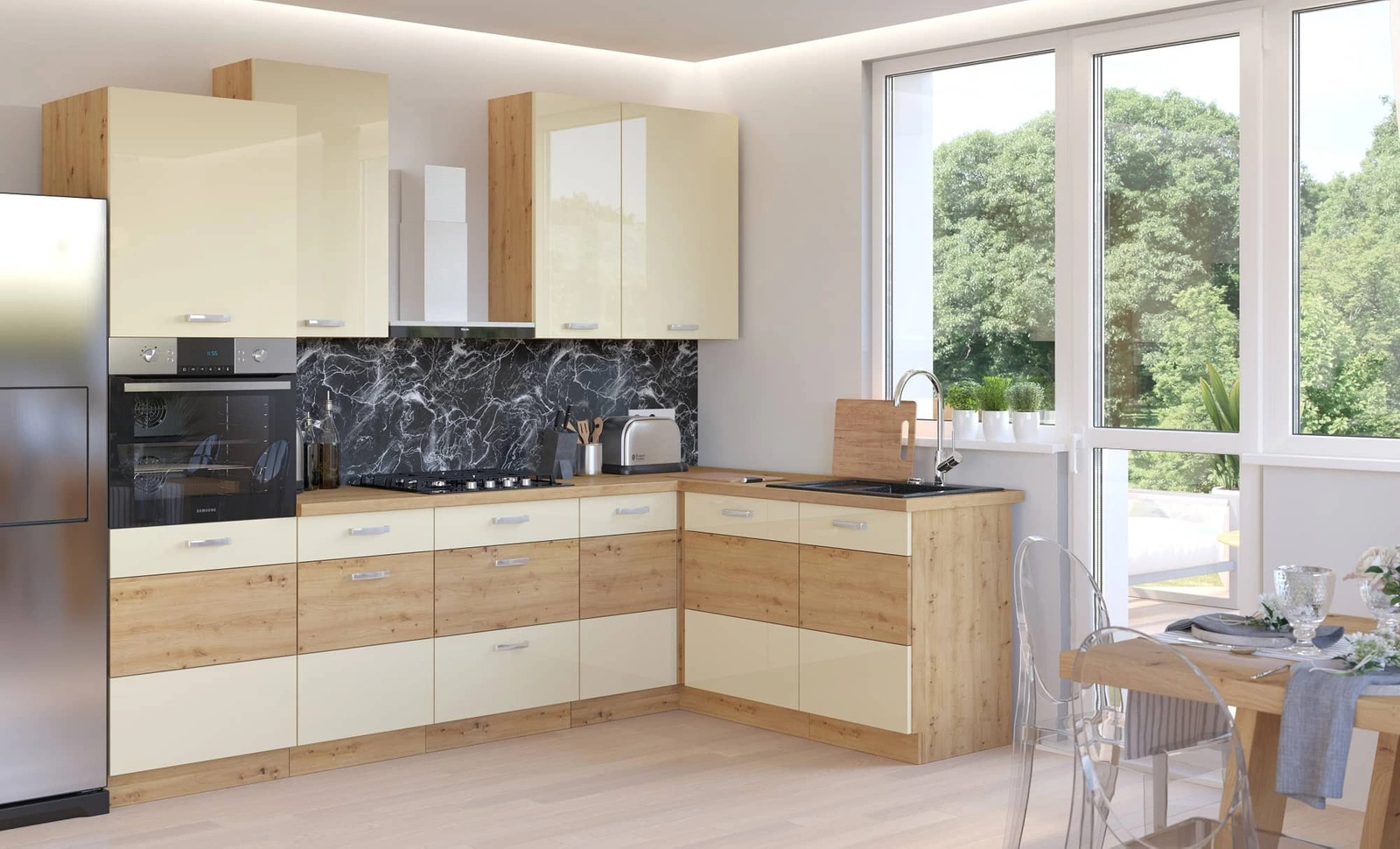 Dzięki uniwersalnemu ustawieniu, meble kuchenne dopasują się do wnętrza każdej kuchni. Kremowe fronty oraz korpusy wykończone w dębowym dekorze, nadają meblom kuchennym szczególnego charakteru. Chromowane, metalowe uchwyty podkreślają elegancję szafek kuchennych.