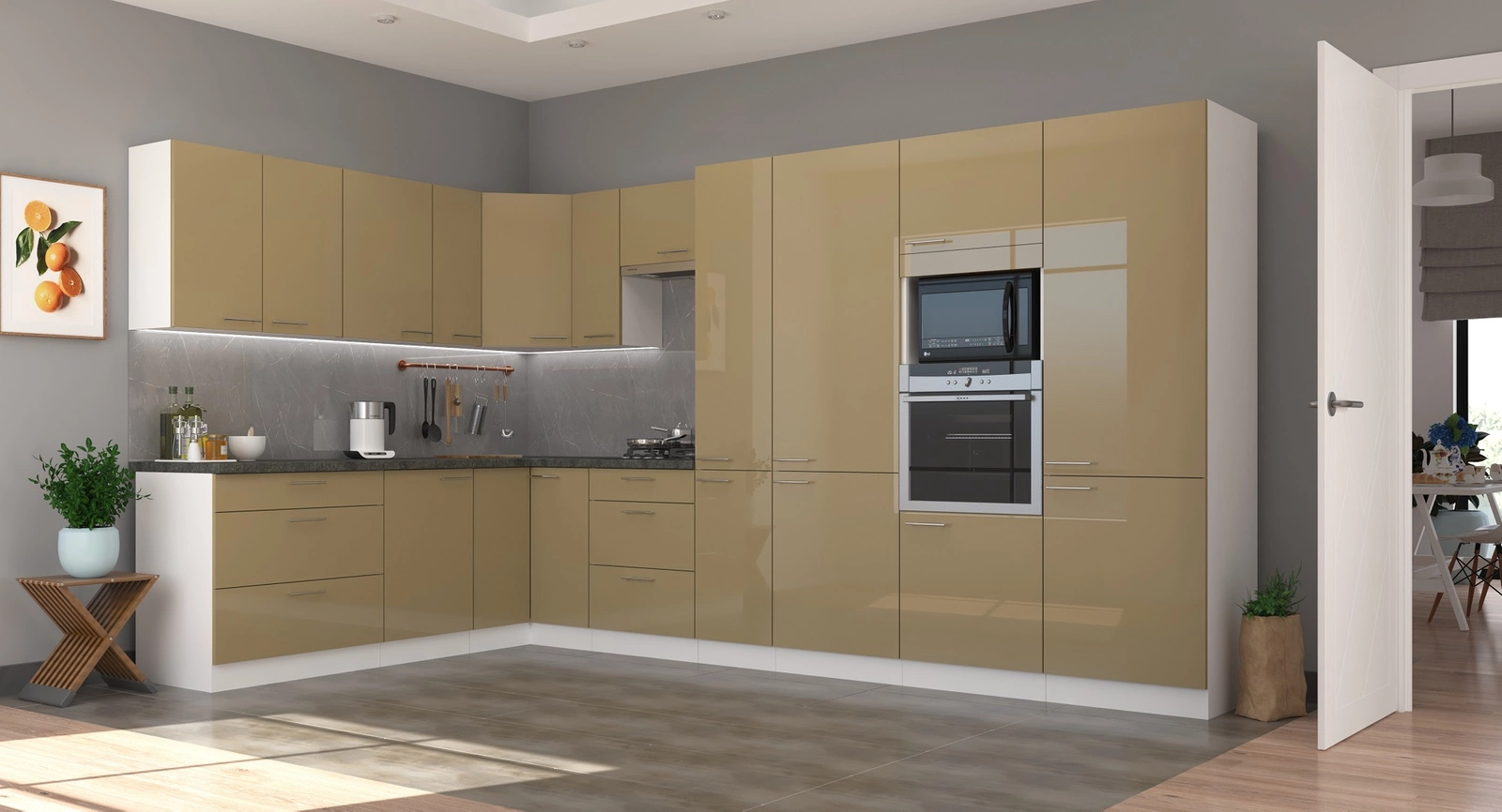 Front szafki kuchennej w kolorze beżowym został wykonany z płyty meblowej oraz oklejone folią w połysku. Obrzeża frontów zabezpiecza okleina ABS, która spełnia dwie funkcje. Jest zabezpieczeniem przeciw wilgoci oraz chroni przed przypadkowym uszkodzeniem.