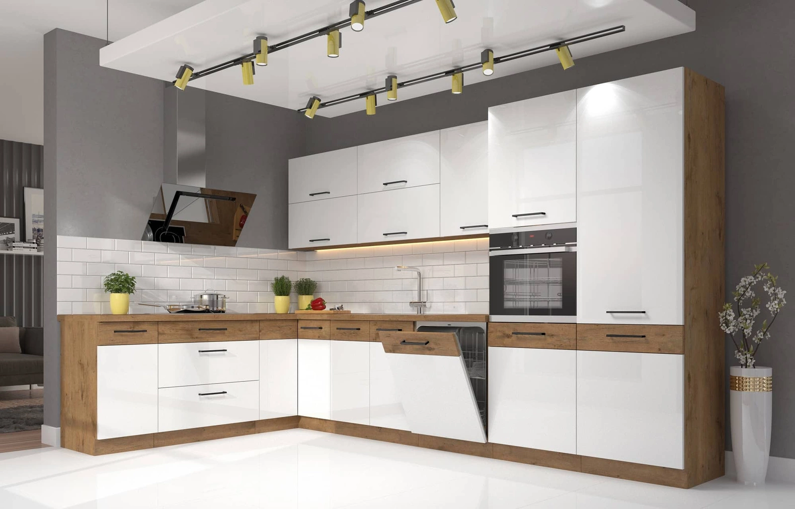 Zestaw mebli kuchennych narożny Vento 210x350 cm to nowoczesne i eleganckie rozwiązanie, które doda Twojej kuchni wyjątkowego charakteru. Wykonany z najwyższej jakości materiałów, zestaw łączy w sobie funkcjonalność i estetykę. Meble te wyróżniają się połączeniem błyszczących białych frontów z naturalnym odcieniem drewna, co nadaje wnętrzu świeżości i ciepła. Liczne szafki, szuflady oraz miejsce na zabudowę sprzętu AGD zapewniają dużo przestrzeni do przechowywania i wygodną organizację kuchennego wyposażenia. Zestaw Vento jest idealnym wyborem dla tych, którzy cenią sobie nowoczesny design i praktyczne rozwiązania.
