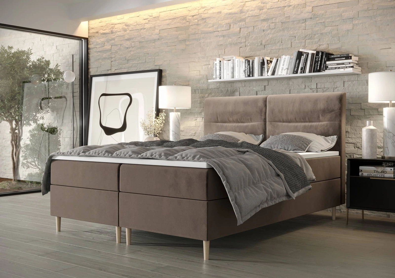 Łóżko wykonane z tkaniny typu velvet Monolith 15 gwarantuje najwyższy komfort i funkcjonalność podczas codziennego wypoczynku w sypialni. Tkanina posiada powłokę hydrofobową, co gwarantuje ograniczone wchłanianie cieczy. Ciekawa struktura tkaniny nadaje wyjątkowego charakteru. Dzięki wszystkim właściwościom użytej tkaniny, łóżko kontynentalne na długo zachowa swój pierwotny wygląd. Konstrukcja łóżka zapewnia dużą stabilność i wygodę użytkowania. Rama łóżka kontynentalnego jest wykonana z drewna oraz płyty meblowej. Lekkie przeszycia na wezgłowiu przyciągają wzrok i nadają łóżku szczególnego charakteru. Łóżko wyposażone zostało w nogi drewniane.