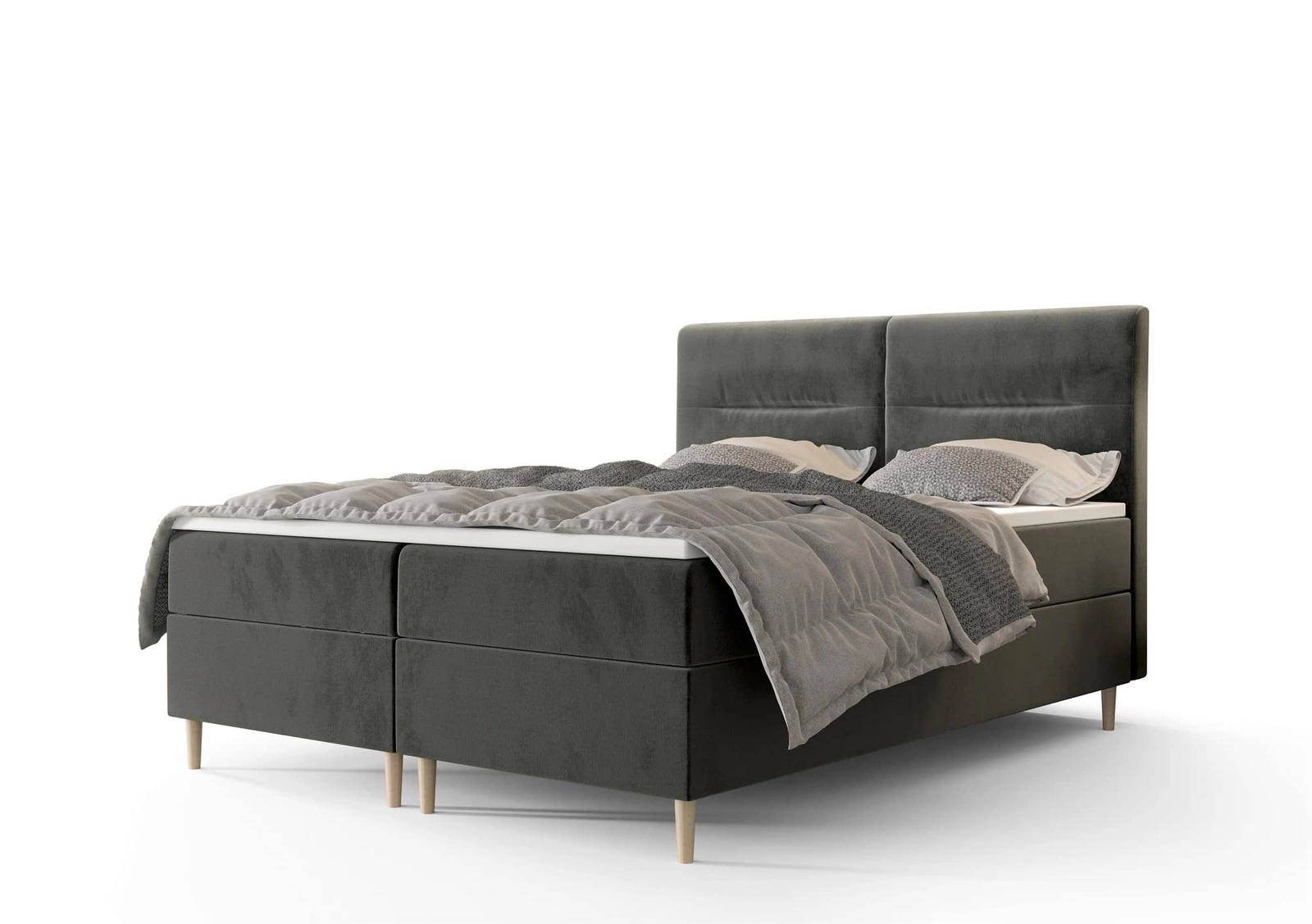 Łóżko wykonane z tkaniny typu velvet Monolith 92 gwarantuje najwyższy komfort i funkcjonalność podczas codziennego wypoczynku w sypialni. Tkanina posiada powłokę hydrofobową, co gwarantuje ograniczone wchłanianie cieczy. Ciekawa struktura tkaniny nadaje wyjątkowego charakteru. Dzięki wszystkim właściwościom użytej tkaniny, łóżko kontynentalne na długo zachowa swój pierwotny wygląd. Konstrukcja łóżka zapewnia dużą stabilność i wygodę użytkowania. Rama łóżka kontynentalnego jest wykonana z drewna oraz płyty meblowej. Lekkie przeszycia na wezgłowiu przyciągają wzrok i nadają łóżku szczególnego charakteru. Łóżko wyposażone zostało w nogi drewniane.