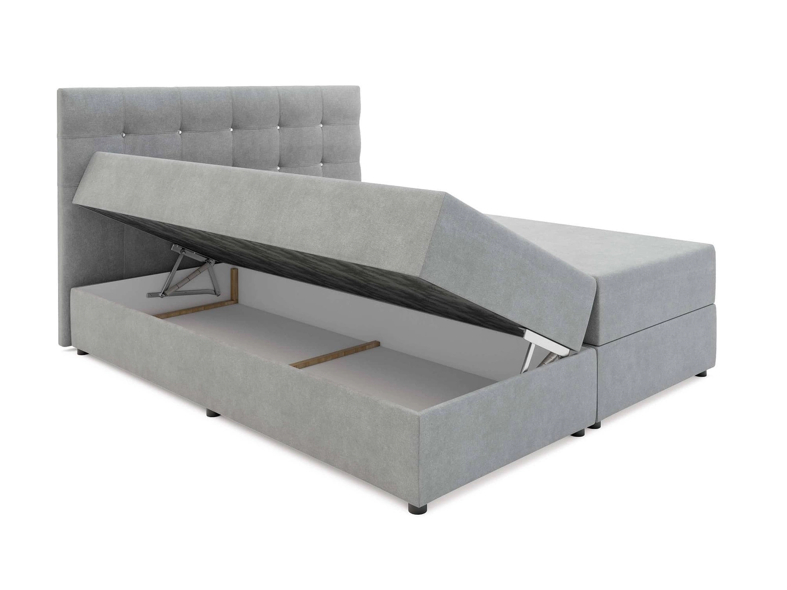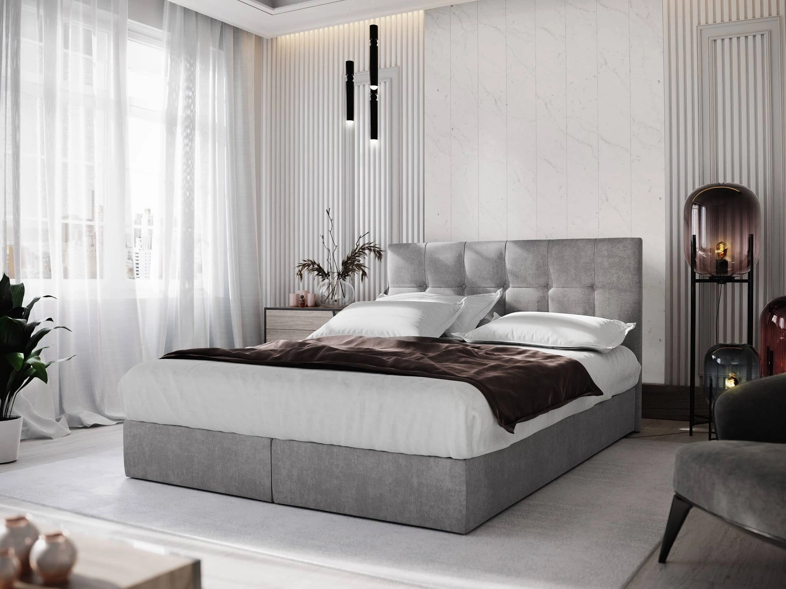 Łóżko wykonane z tkaniny typu welur Cosmic 160 gwarantuje najwyższy komfort i funkcjonalność podczas codziennego wypoczynku w sypialni. Tkanina jest plamoodporna oraz posiada powłokę hydrofobową, co gwarantuje ograniczone wchłanianie cieczy. Dzięki temu łóżko jest łatwo utrzymać w czystości. Konstrukcja łóżka zapewnia dużą stabilność i wygodę użytkowania. Rama łóżka kontynentalnego jest wykonana z drewna oraz płyty meblowej. Wezgłowie wykończone guzikami oraz ozdobnym przeszyciem przyciąga wzrok i nadaje łóżku szczególnego charakteru.
