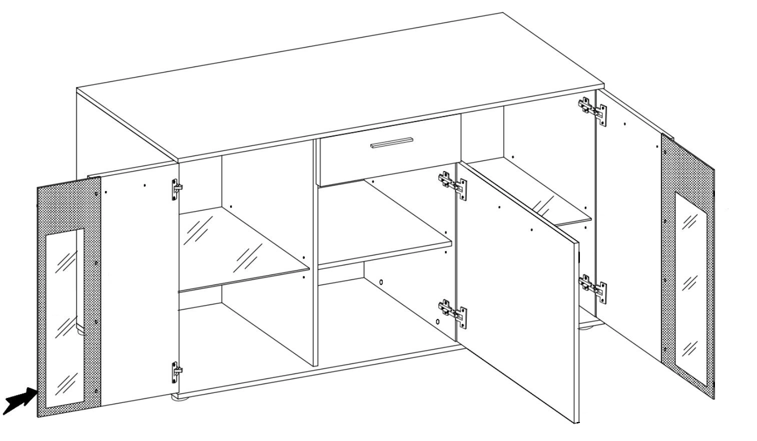 Mebel jest skonstruowany z 3 drzwi i 1 szufladyPrzeszklone drzwi pozwolą wyeksponować stylowe dodatki. Szyby zewnętrznych drzwi komody są wykończone ramką w kolorze czarnym. W komodzie Senja są zastosowane srebrne uchwyty wykonane z tworzywa sztucznego.