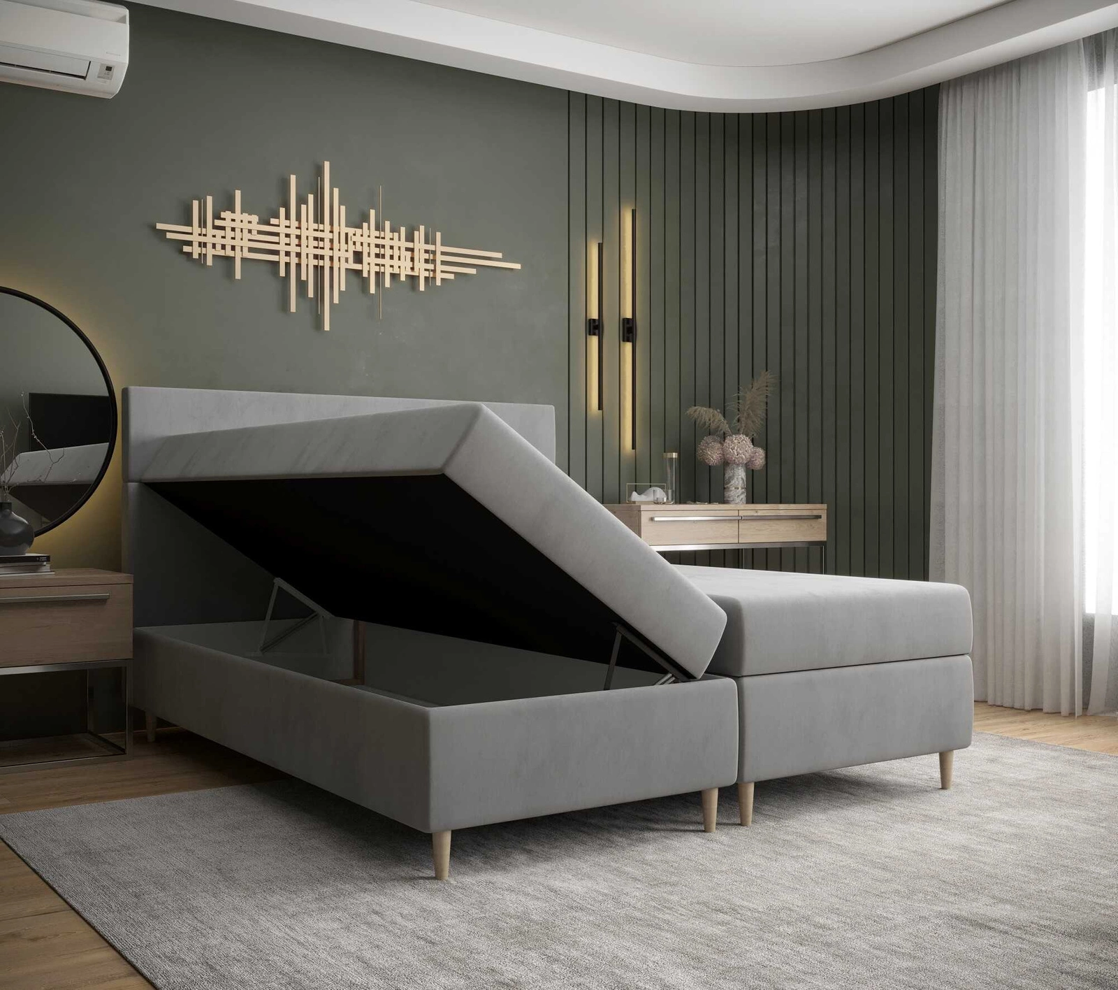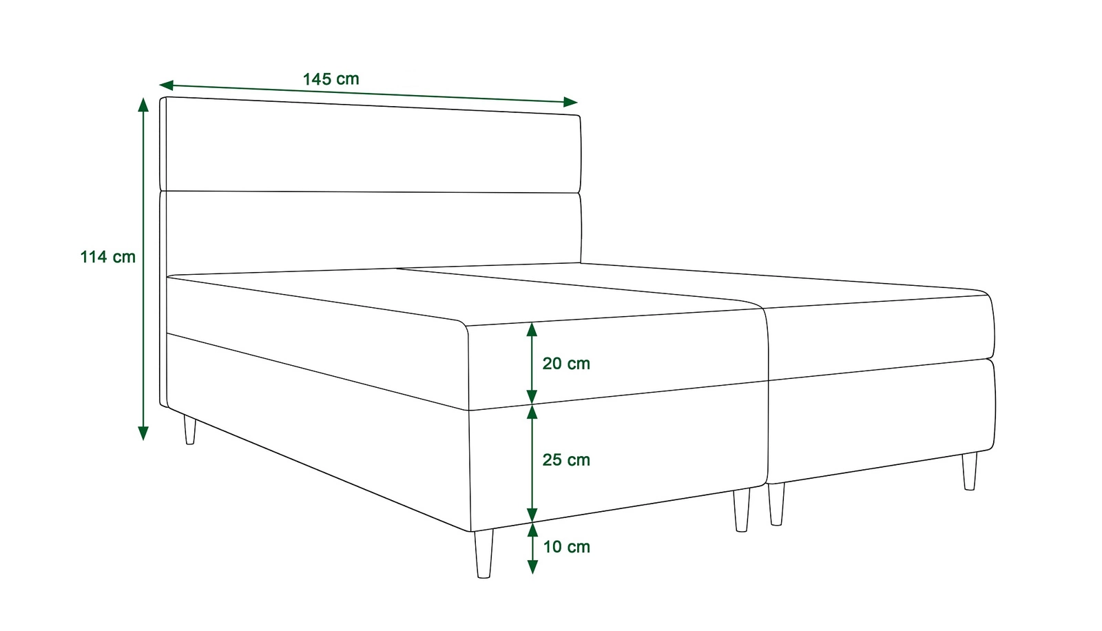 Łóżko wykonane z tkaniny typu plusz Itaka 27 gwarantuje najwyższy komfort i funkcjonalność podczas codziennego wypoczynku w sypialni. Tkanina jest wyprodukowana w technologii easy clean oraz wykazuje właściwości ograniczające wchłanianie cieczy. Dzięki wszystkim właściwościom użytej tkaniny, łóżko kontynentalne na długo zachowa swój pierwotny wygląd. Konstrukcja łóżka zapewnia dużą stabilność i wygodę użytkowania. Rama łóżka kontynentalnego jest wykonana z drewna oraz płyty meblowej. Stylowe przeszycie na zagłówku przyciąga wzrok i nadaje łóżku szczególnego charakteru. Nogi łóżka są wykonane z drewna bukowego.
