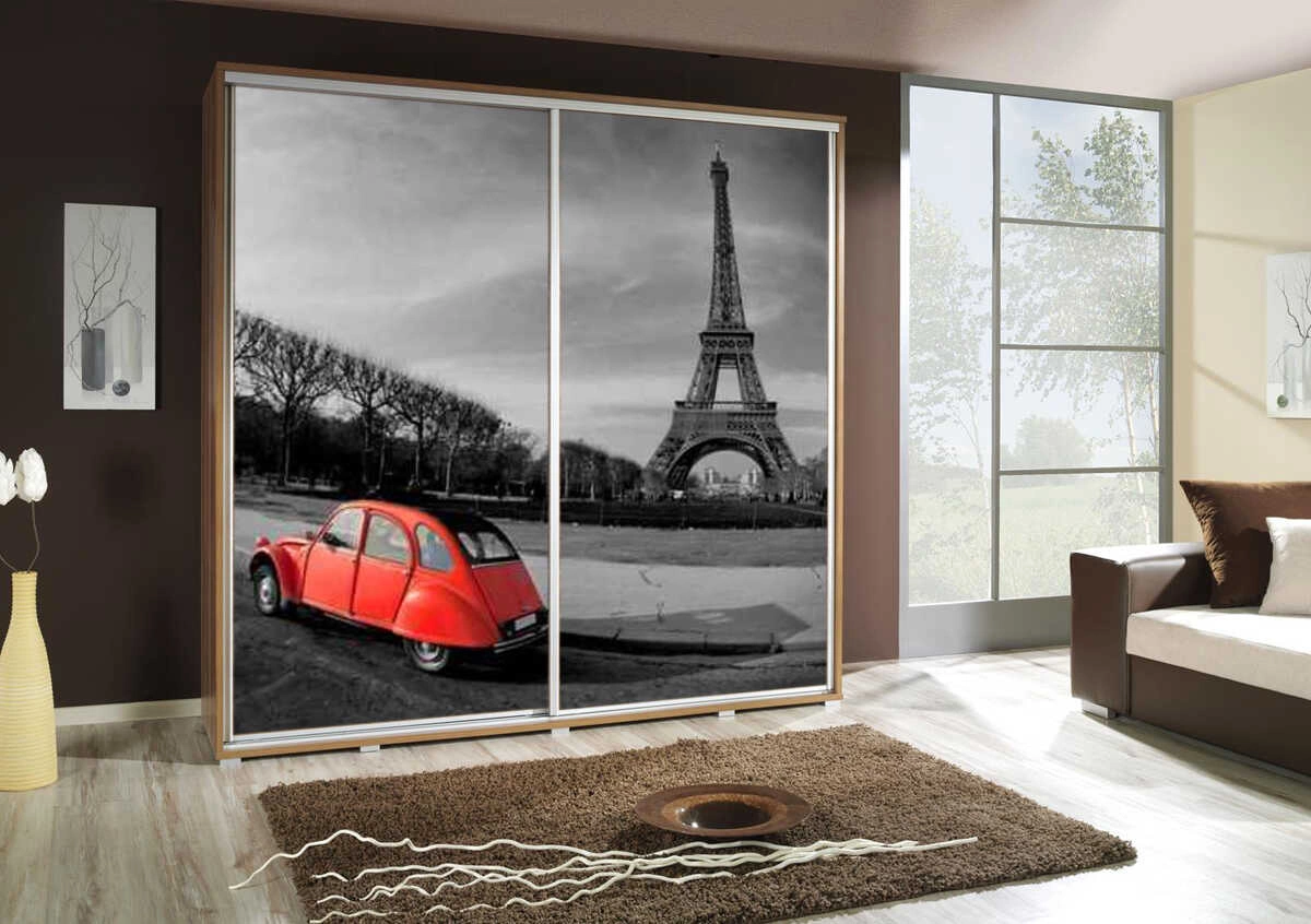 Szafa przesuwna Artistino z grafiką Paryża w kolorze dąb catania to przepis na nowoczesne oraz funkcjonalne wnętrze w pokoju dziecięcym.