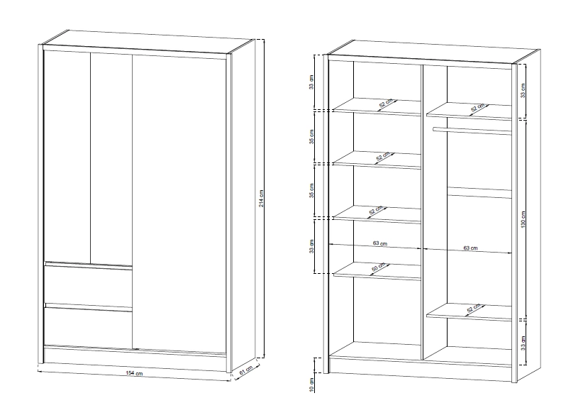 Szerokość 134 cm, wysokość 214 cm oraz głębokość 62 cm sprawiają, że szafa przesuwna wpasuje się do każdego typu pomieszczenia! Szafa przesuwna gwarantuje komfortowe i bezproblemowe korzystanie oraz trwałość całego mebla przez wiele lat użytkowania.