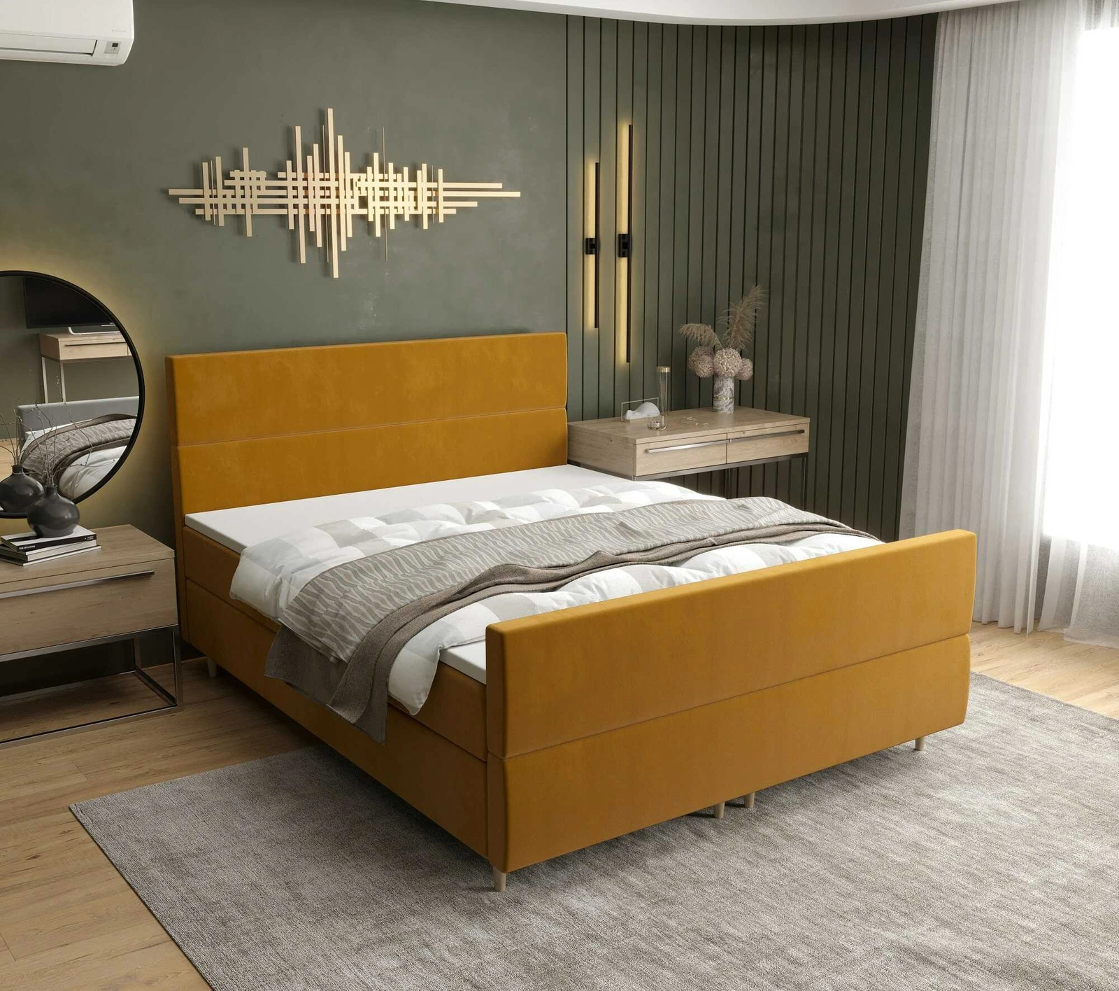 Łóżko kontynentalne Benet 160x200 w kolorze musztardowym to stylowy mebel, który idealnie wkomponuje się do każdej sypialni.