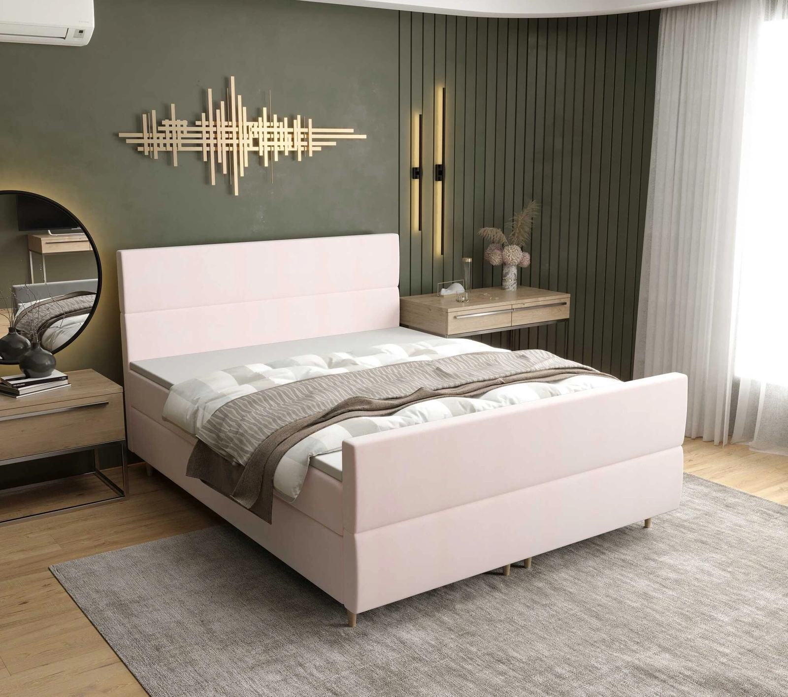 Łóżko kontynentalne Benet 180x200 pudrowy róż w nowoczesnym skandynawskim stylu z charakterystycznym wezgłowiem oraz zanóżkiem