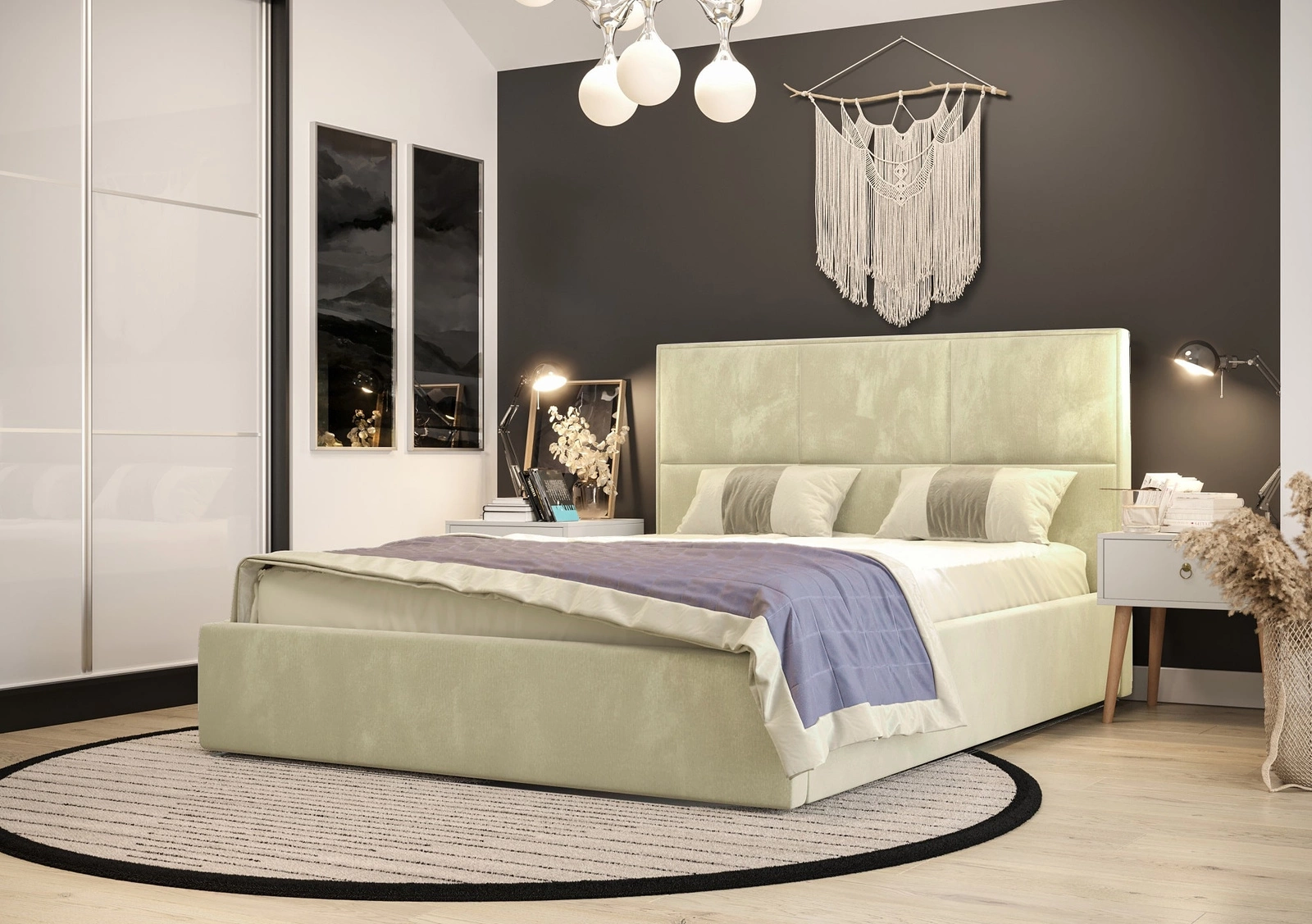 Łóżko wykonane z tkaniny typu velvet Monolith 02 gwarantuje najwyższy komfort i funkcjonalność podczas codziennego wypoczynku w sypialni. Tkanina posiada powłokę hydrofobową, co gwarantuje ograniczone wchłanianie cieczy. Ciekawa struktura tkaniny nadaje wyjątkowego charakteru. Dzięki wszystkim właściwościom użytej tkaniny, łóżko na długo zachowa swój pierwotny wygląd. Konstrukcja łóżka zapewnia dużą stabilność i wygodę użytkowania. Rama łóżka jest wykonana z drewna oraz płyty meblowej. Wygodny i praktyczny zagłówek jest wykończony sześcioma prostokątnymi panelami.