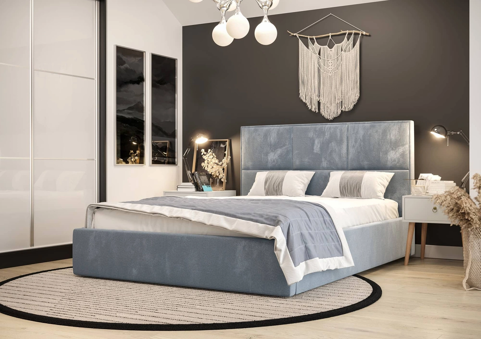 Łóżko tapicerowane Hestia 180x200 z pojemnikiem błękitny w nowoczesnym skandynawskim stylu z wygodnym zagłówkiem