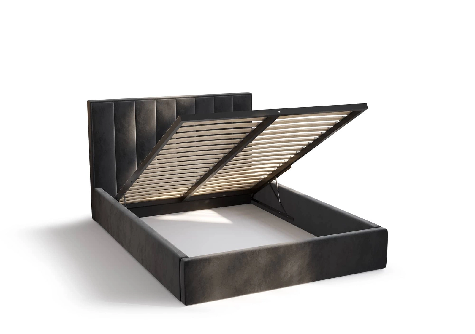 Łóżko wykonane z tkaniny typu velvet Monolith 15 gwarantuje najwyższy komfort i funkcjonalność podczas codziennego wypoczynku w sypialni. Tkanina posiada powłokę hydrofobową, co gwarantuje ograniczone wchłanianie cieczy. Ciekawa struktura tkaniny nadaje wyjątkowego charakteru. Dzięki wszystkim właściwościom użytej tkaniny, łóżko na długo zachowa swój pierwotny wygląd. Konstrukcja łóżka zapewnia dużą stabilność i wygodę użytkowania. Rama łóżka jest wykonana z drewna oraz płyty meblowej. Wygodny i praktyczny zagłówek jest wykończony ośmioma pionowymi panelami.