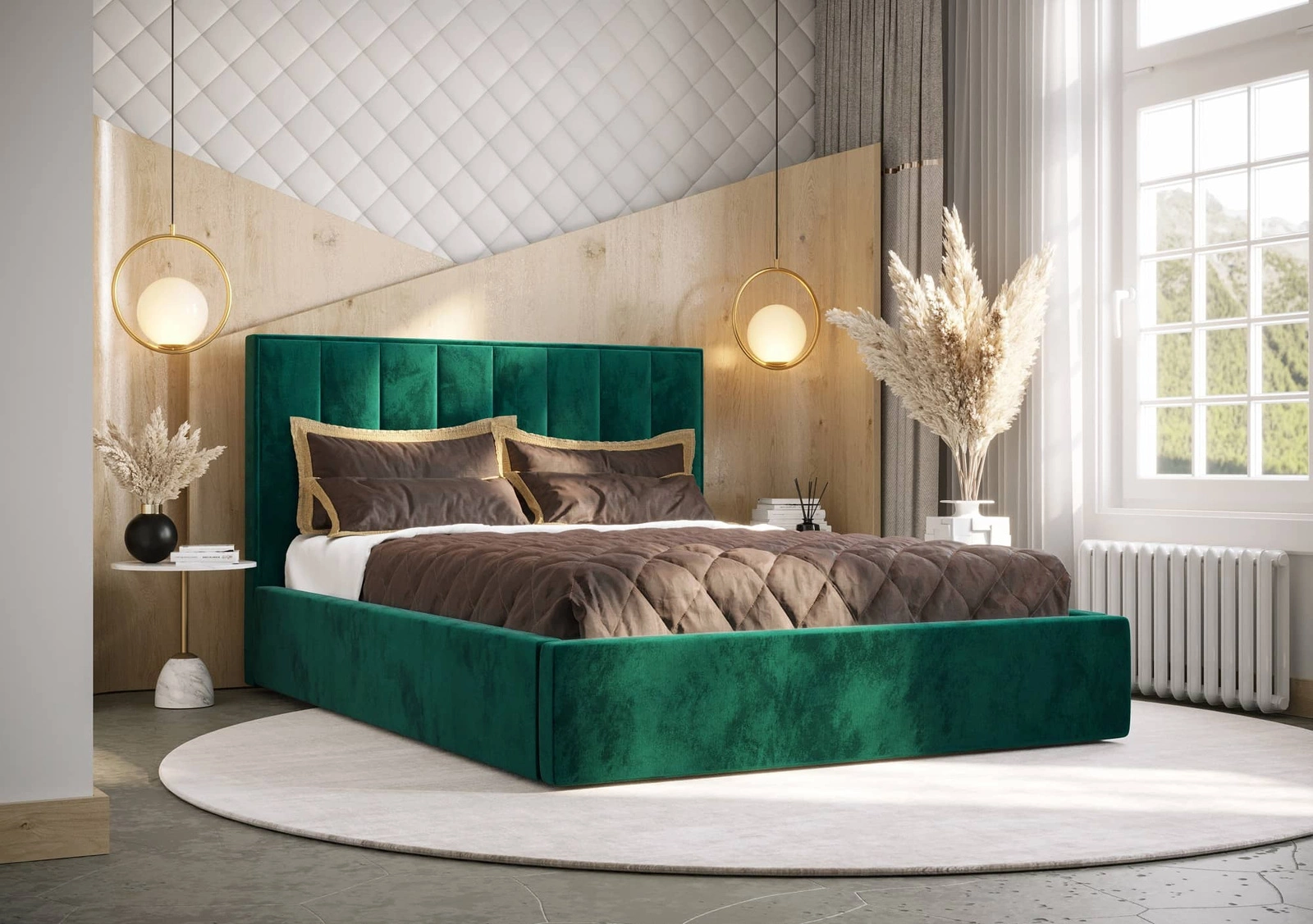 Łóżko tapicerowane Rinus 160x200 w kolorze butelkowa zieleń to idealne rozwiązanie do sypialni urządzonej w stylu nowoczesnym, skandynawskim oraz klasycznym.