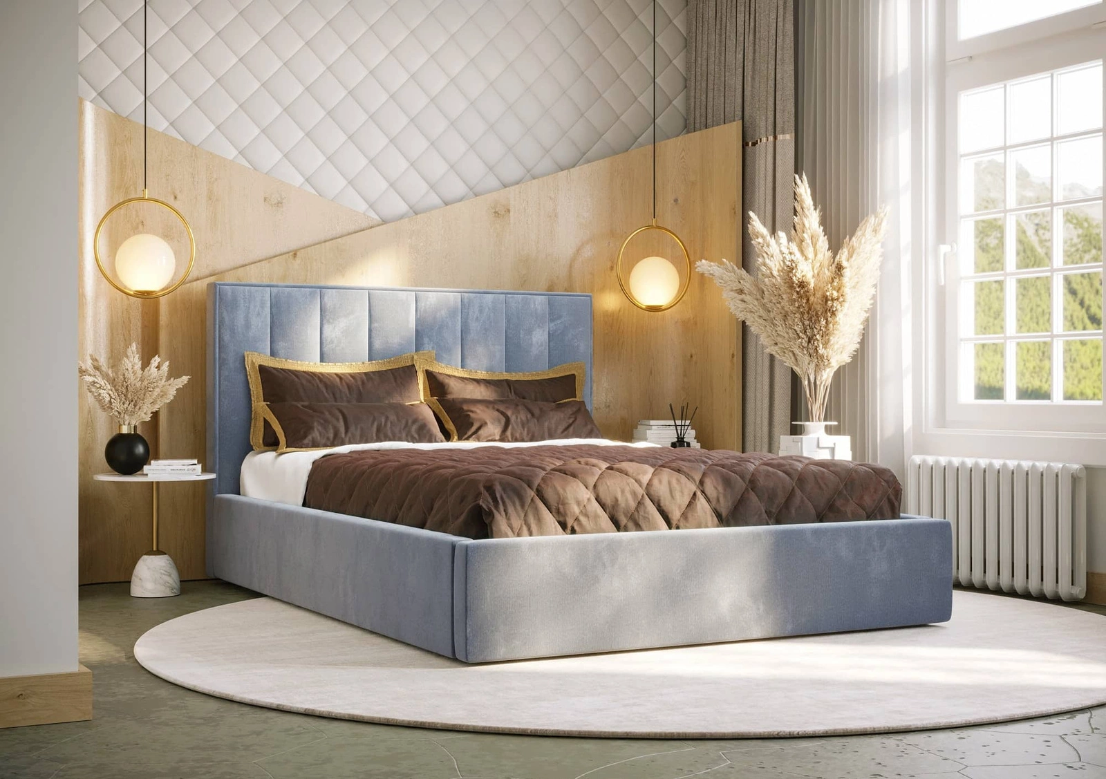 Łóżko tapicerowane Rinus 140x200 w kolorze błękitnym to idealne rozwiązanie do sypialni urządzonej w stylu nowoczesnym, skandynawskim oraz klasycznym.