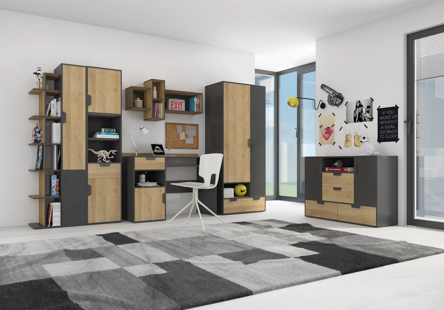 Komoda z szufladami Nano w kolorze grafit / dąb riviera to przepis na nowoczesne oraz funkcjonalne wnętrze w pokoju nastolatka lub biura.